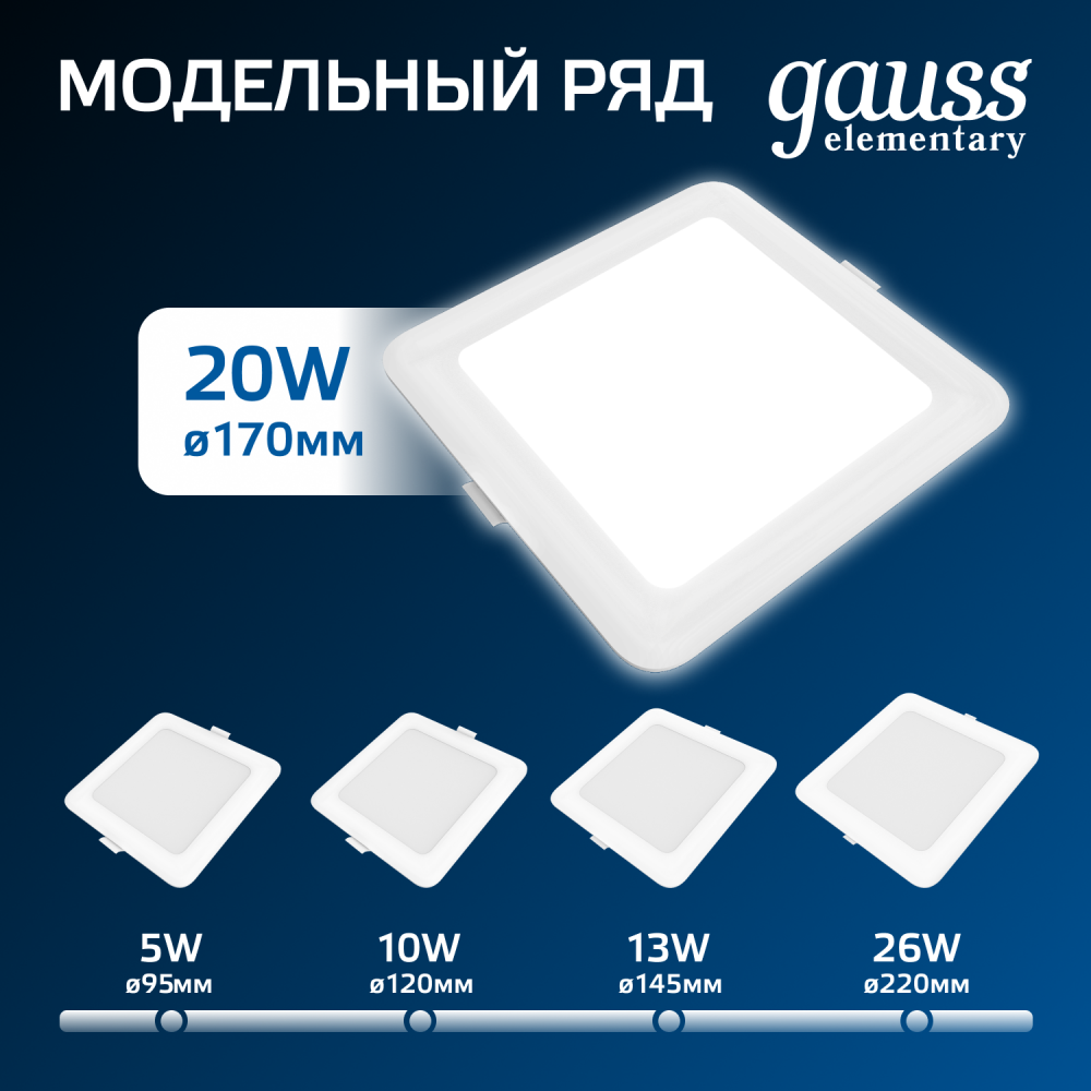 Полное описание товара Светильник светодиодный ДВО 20 Вт 1700 лм 4000К AC 220В IP20 квадрат 170х170х26мм монт разм 140х140мм Пластик Elementary (GAUSS) 998420218