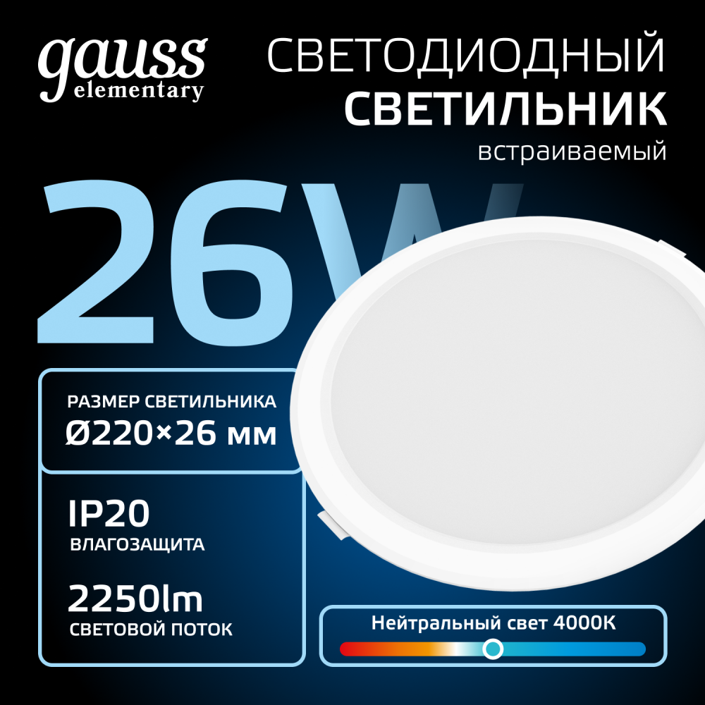 Полное описание товара Светильник светодиодный ДВО 26 Вт 2250 лм 4000К AC 220В IP20 круг D225х26мм монт d190мм Пластик Elementary (GAUSS) 997520224