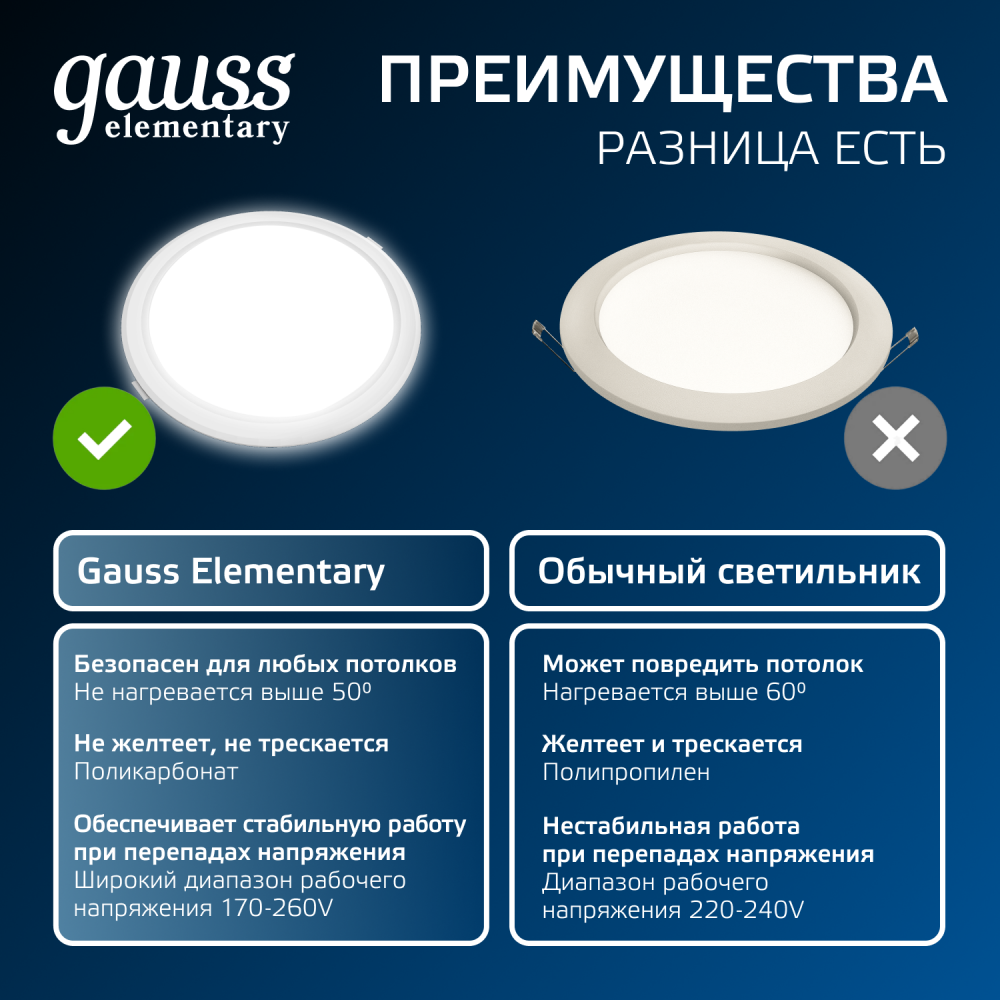 Серия даунлайтов Gauss Elementary отлично подойдут для организации основного освещения в жилых и бытовых помещениях, где необходимо добавить световой акцент. Благодаря матовому рассеивателю обеспечивается качественное освещение с широким углом и скрываются слепящие элементы устройства.