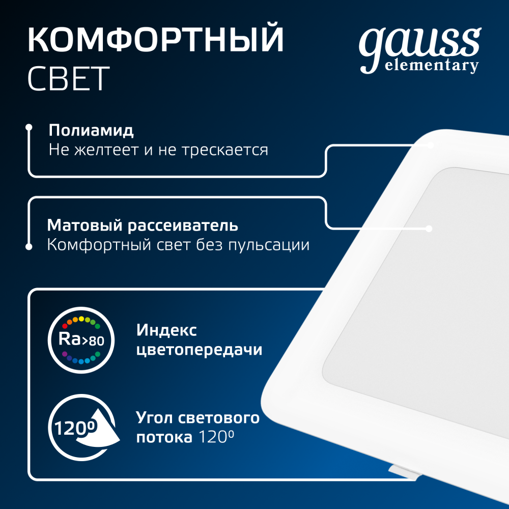Серия даунлайтов Gauss Elementary отлично подойдут для организации основного освещения в жилых и бытовых помещениях, где необходимо добавить световой акцент. Благодаря матовому рассеивателю обеспечивается качественное освещение с широким углом и скрываются слепящие элементы устройства.