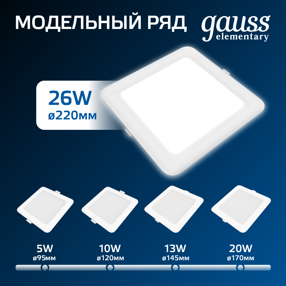 Полное описание товара Светильник светодиодный ДВО 26 Вт 2250 лм 4000К AC 220В IP20 квадрат 225х225х26мм монт разм 190х190мм Пластик Elementary (GAUSS) 998520224