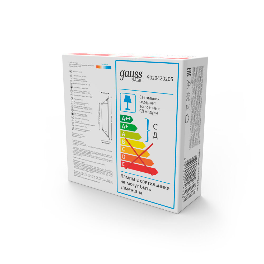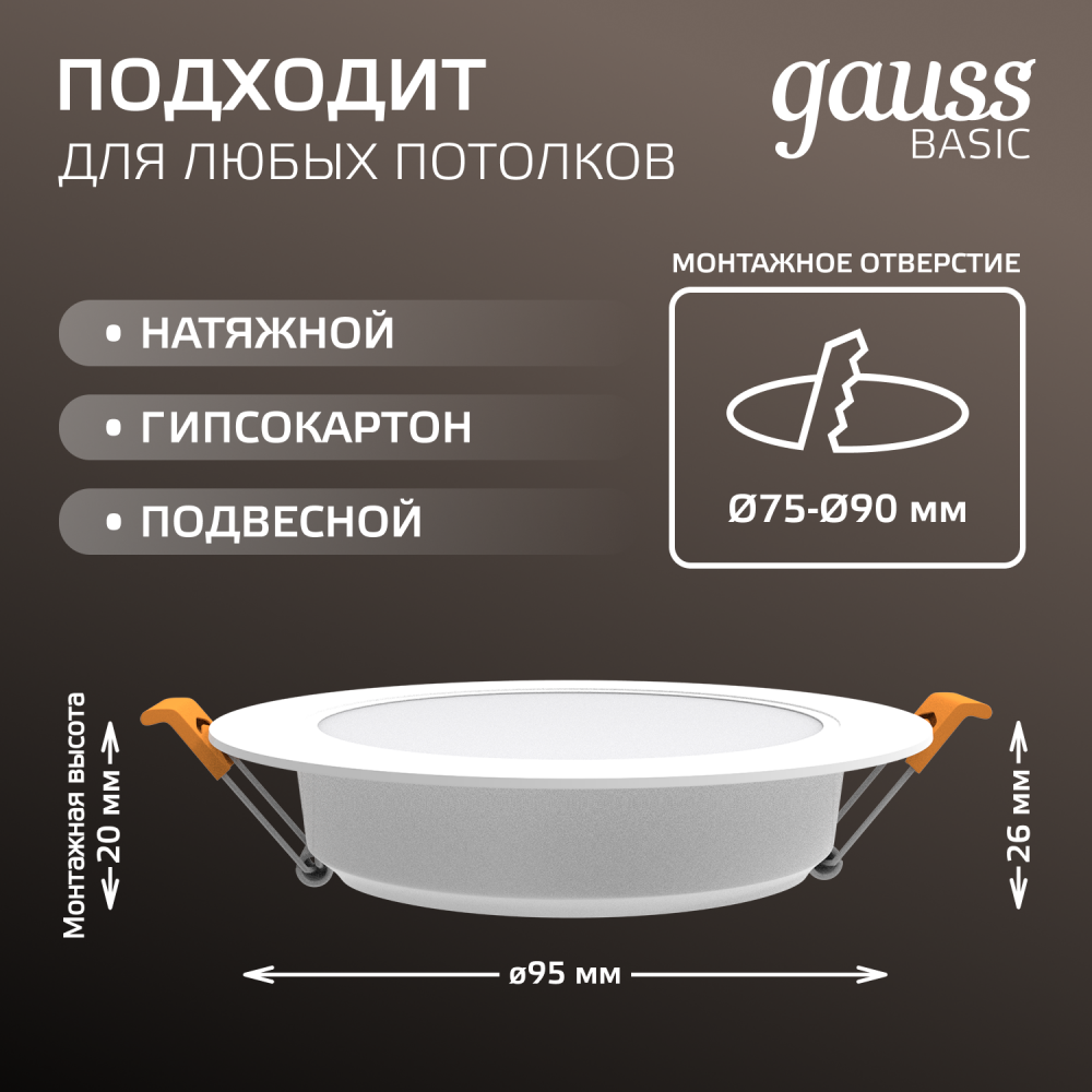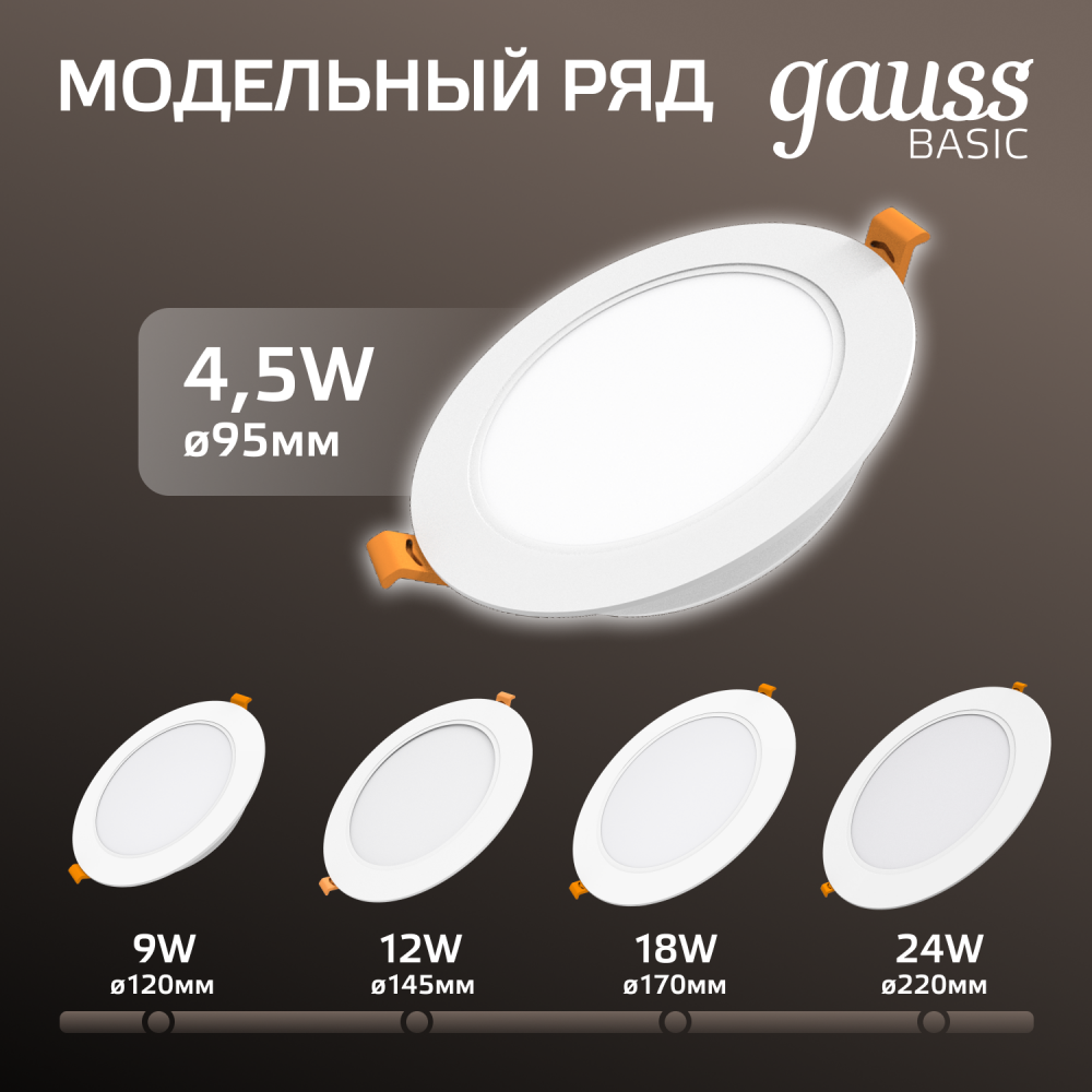 Полное описание товара Светильник светодиодный ДВО 4.5 Вт 300 лм 4000К AC 220В IP20 круг D95х26мм монт d75мм Пластик Basic (GAUSS) 9029420205