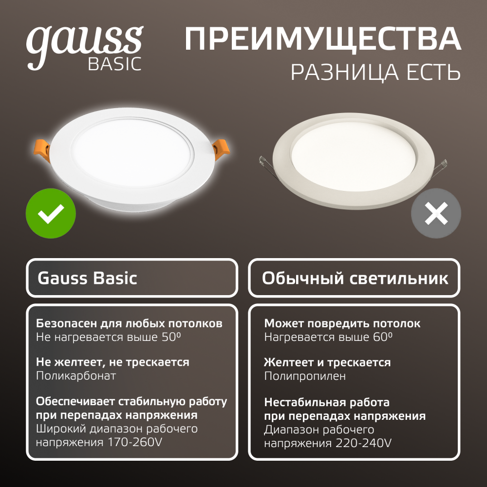 Даунлайты Gauss отлично подойдут для организации основного освещения в жилых и бытовых помещениях, где необходимо добавить световой акцент. Отличительной особенностью даунлайтов является фронтальное расположение диодов, что влияет на световой поток. Светильники-даунлайты – это эффективный способ получить равномерную засветку помещения. Благодаря матовому рассеивателю обеспечивается качественное освещение с широким углом и скрываются слепящие элементы устройства. Встроенный в корпус драйвер облегчает монтаж. Малая монтажная высота экономит за потолочное пространство.
