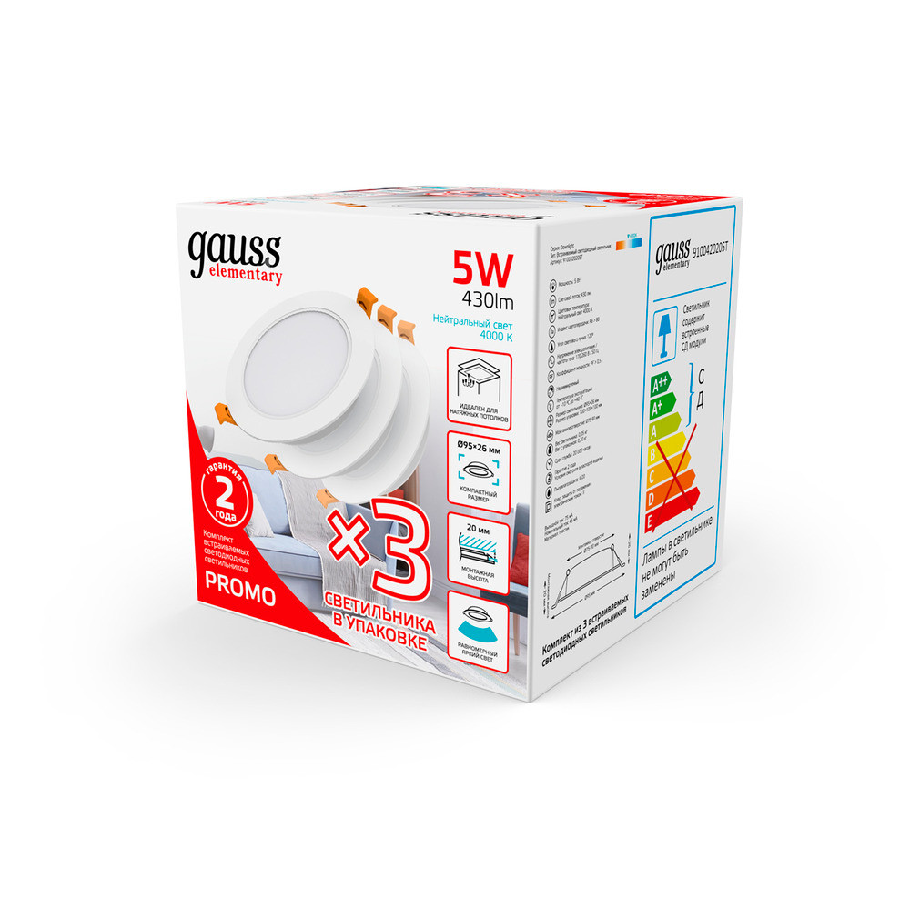 Полное описание товара Светильник светодиодный ДВО 5 Вт 430 лм 4000К AC 220В IP20 круг D95х26мм монт d75мм Пластик упаковка 3шт Elementary Gauss (GAUSS) 9100420205T