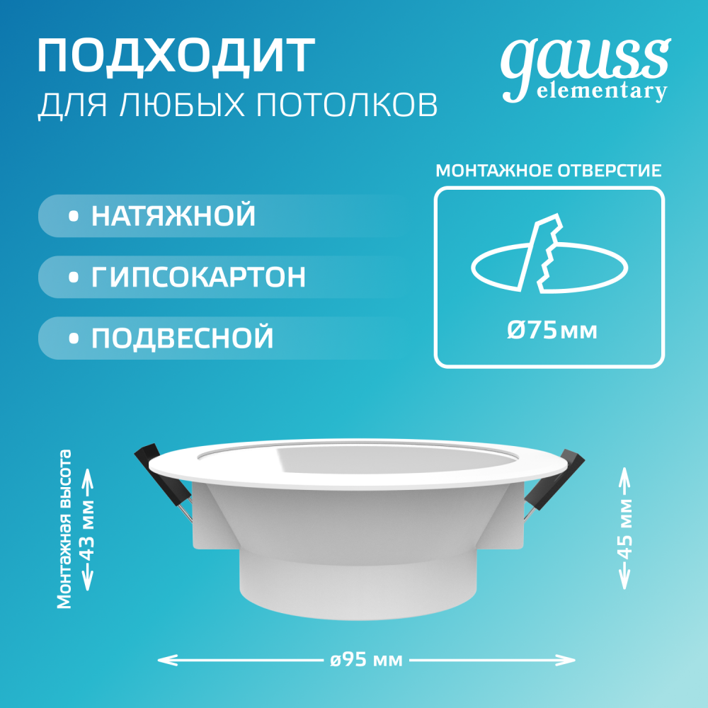 Полное описание товара Светильник светодиодный ДВО 5.5 Вт 450 лм 4000К AC 220В IP54 круг D90х44мм монт d75мм Пластик Elementary (GAUSS) 999420205