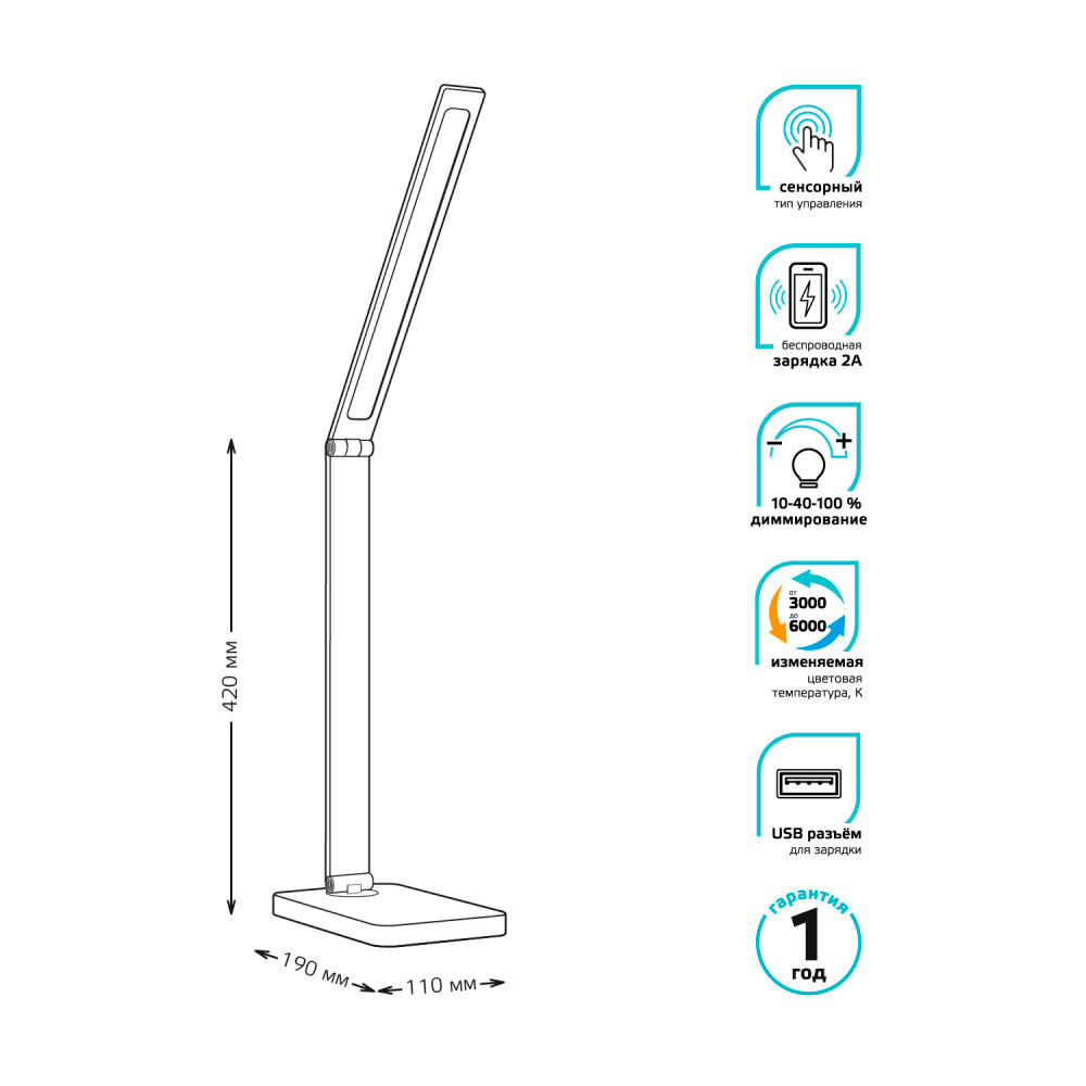 Полное описание товара Светильник светодиодный настольный 10 Вт 600 лм 3000-6000К AC 220В Черный IP20 Металл, пластик складная стойка сенсорное управление яркости и температуры освещения беспроводная и USB зарядка телефона Qplus Gauss (GAUSS) GT5012