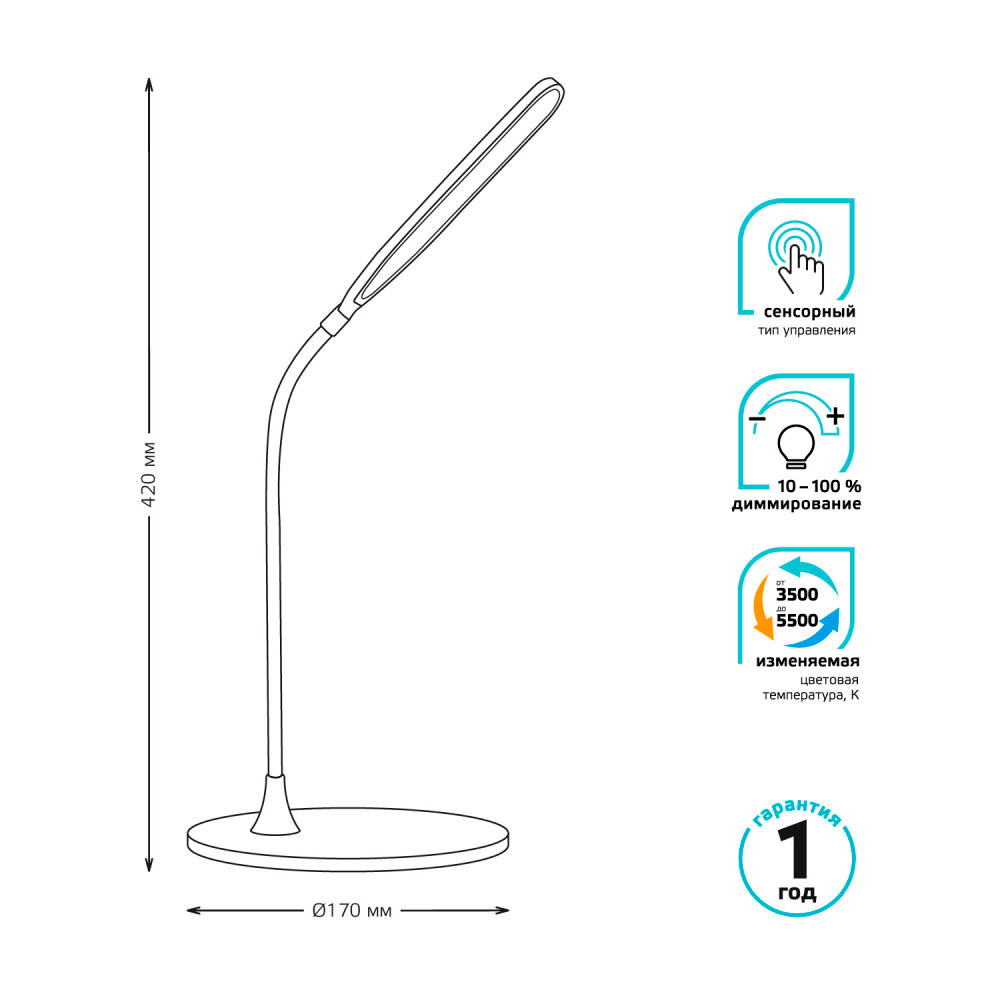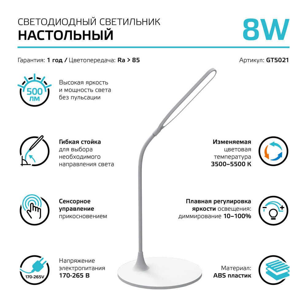 Полное описание товара Светильник светодиодный настольный 8 Вт 500 лм 3500-5500К AC 220В Белый IP20 Пластик гибкая стойка сенсорное управление яркости и температуры освещения Qplus Gauss (GAUSS) GT5021