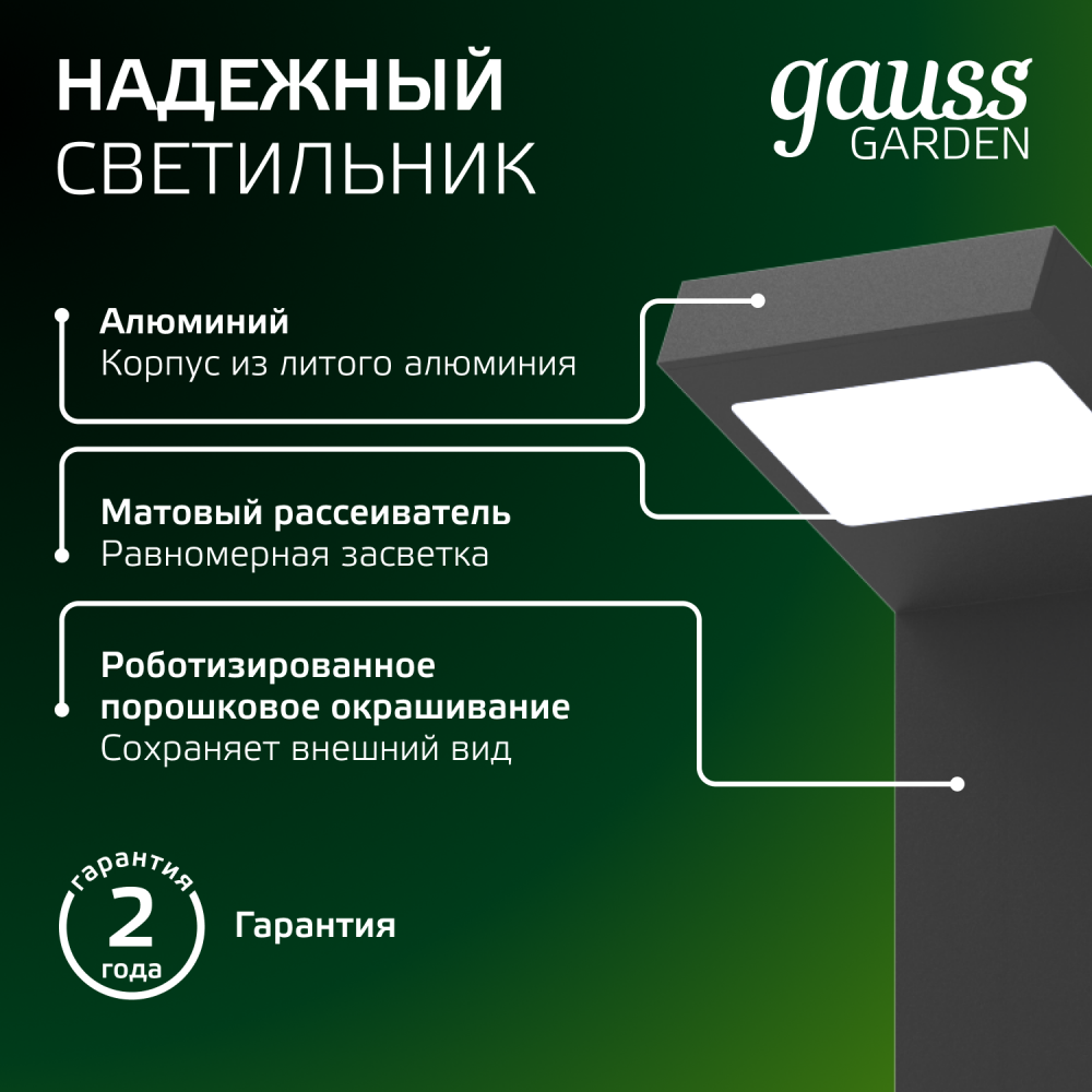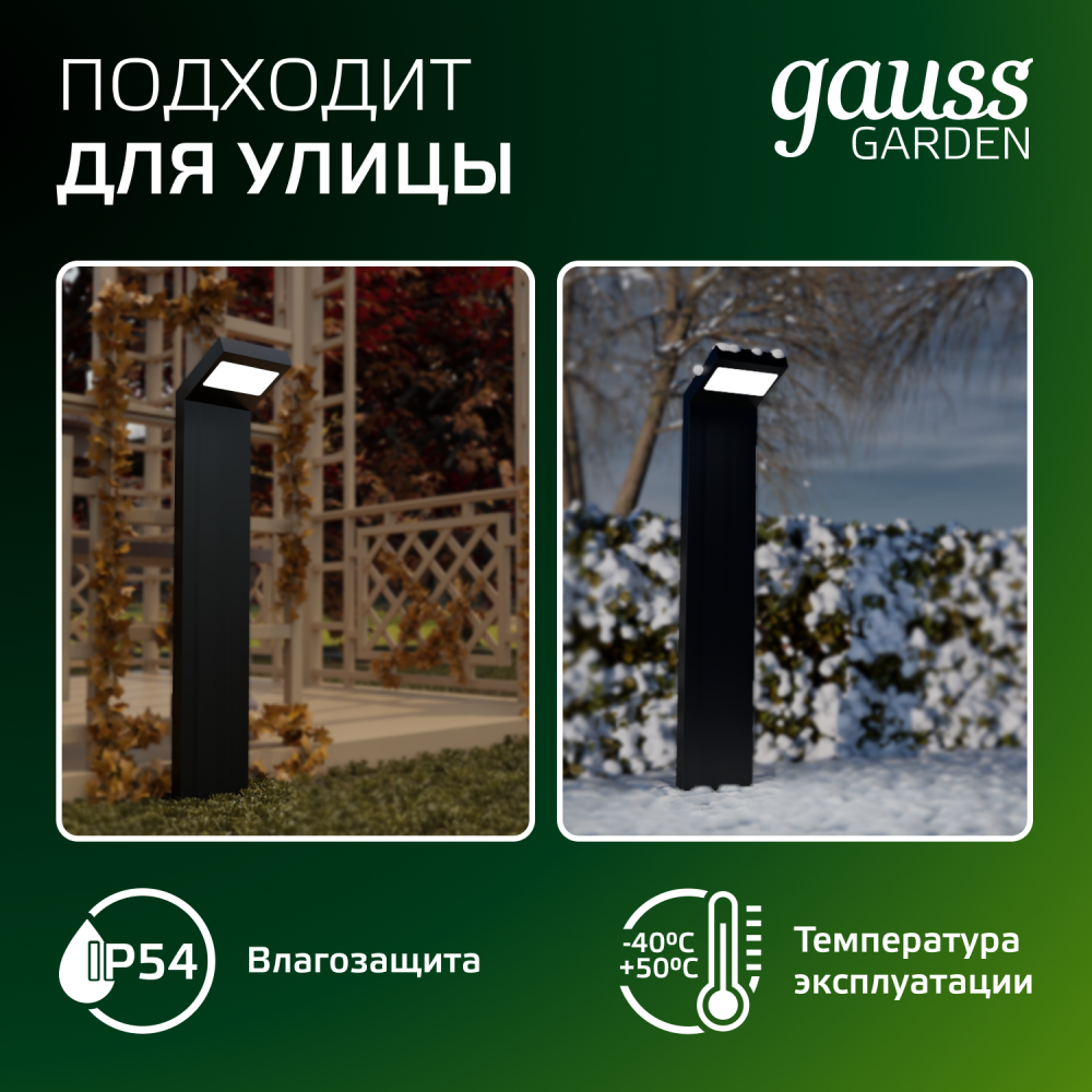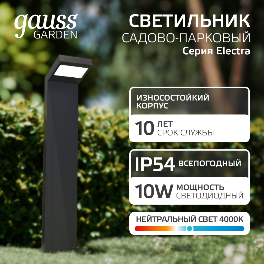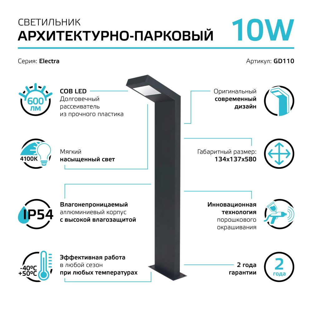 Полное описание товара Светильник светодиодный садово-парковый столб ДТУ 10 Вт 600 лм 4000К AC 220В IP54 134х134х580мм Electra (GAUSS) GD110