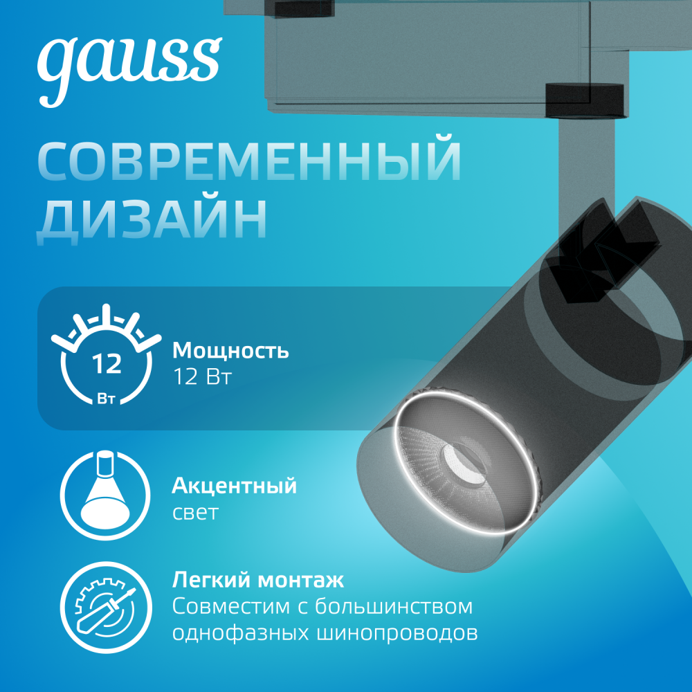 Полное описание товара Светильник светодиодный трековый на шинопровод ДПО 12 Вт 1100 лм 4000К AC 220В Черный IP20 D100х185мм однофазный угол 36 грд Track Gauss (GAUSS) TR080