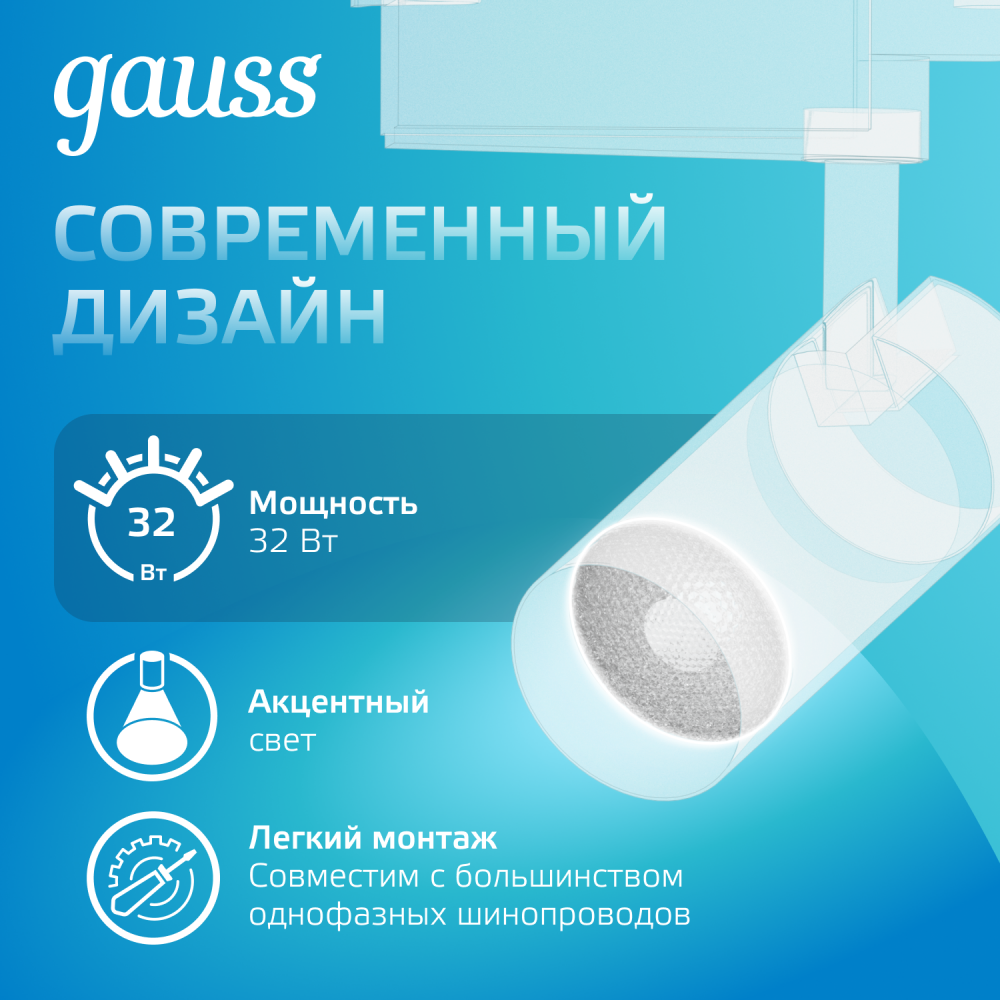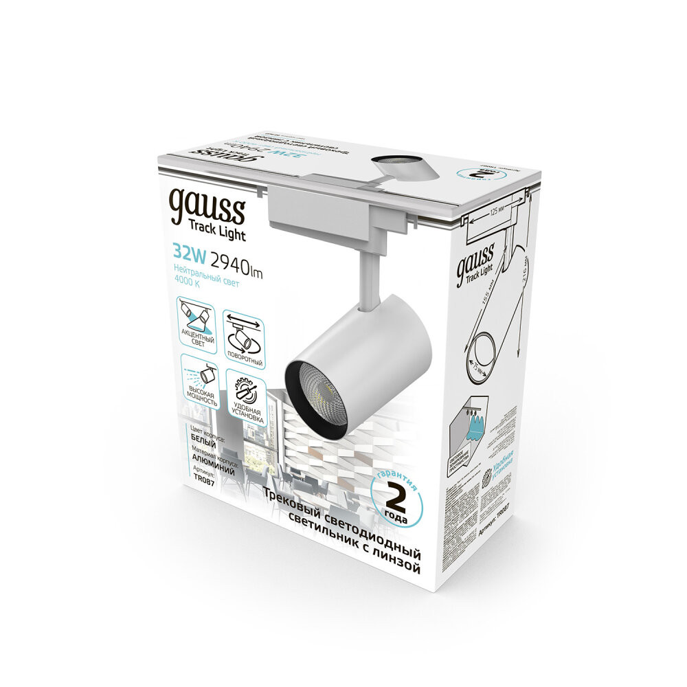 Полное описание товара Светильник светодиодный трековый на шинопровод ДПО 32 Вт 2940 лм 4000К AC 220В Белый IP20 D160х216мм однофазный угол 36 грд Track (GAUSS) TR087