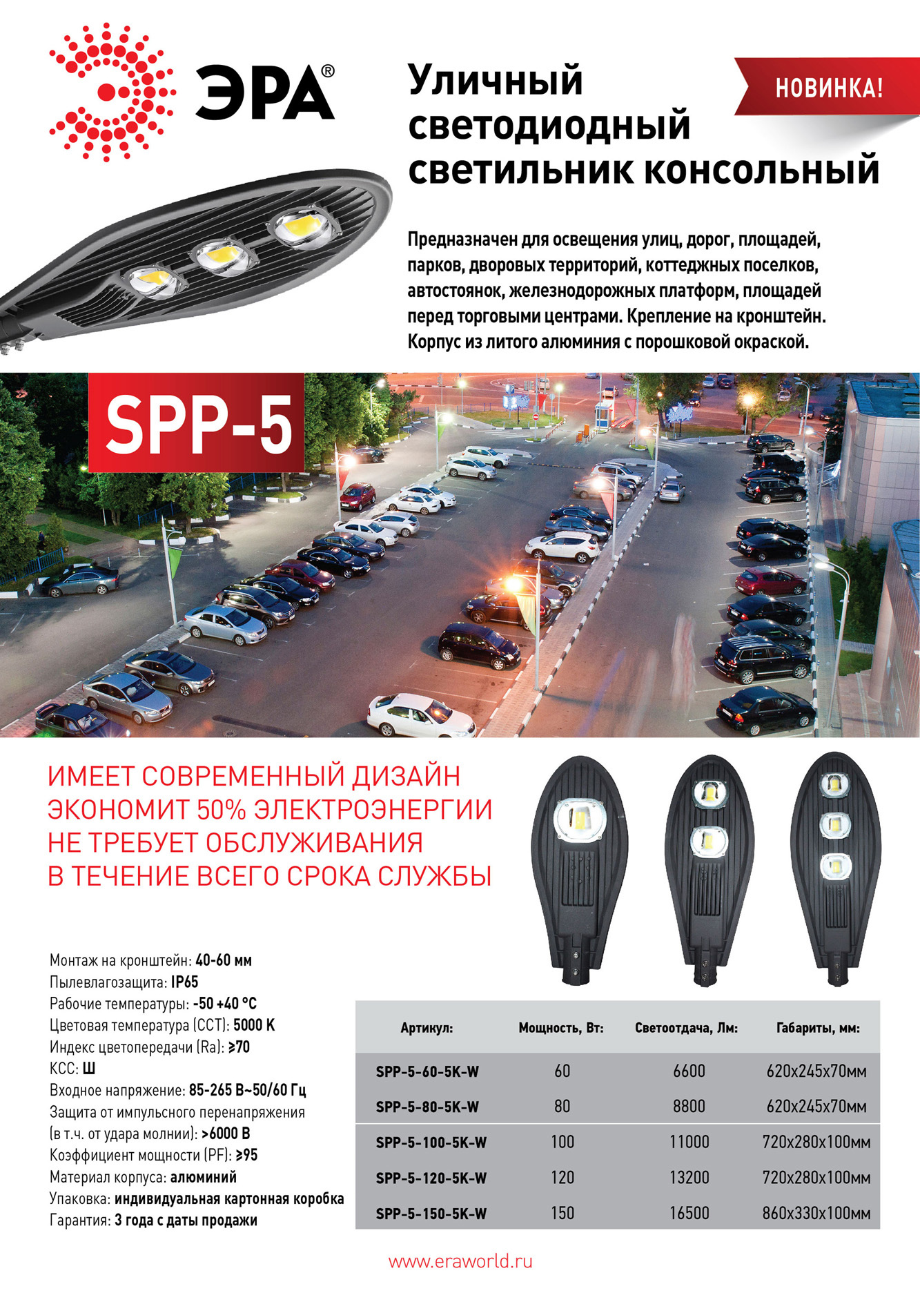 Полное описание товара Светильник светодиодный уличный консольный ДКУ 150Вт 5000К IP65 22500Лм КСС Ш IC-COB 48-60мм SPP-5-150-5K-W (ЭРА) Б0029445