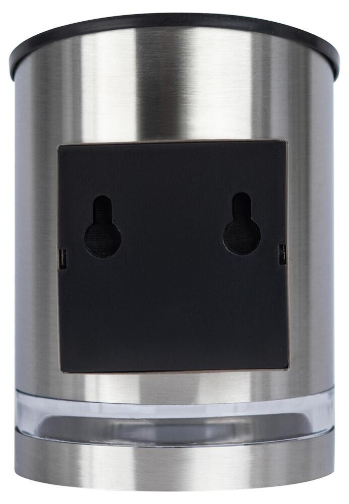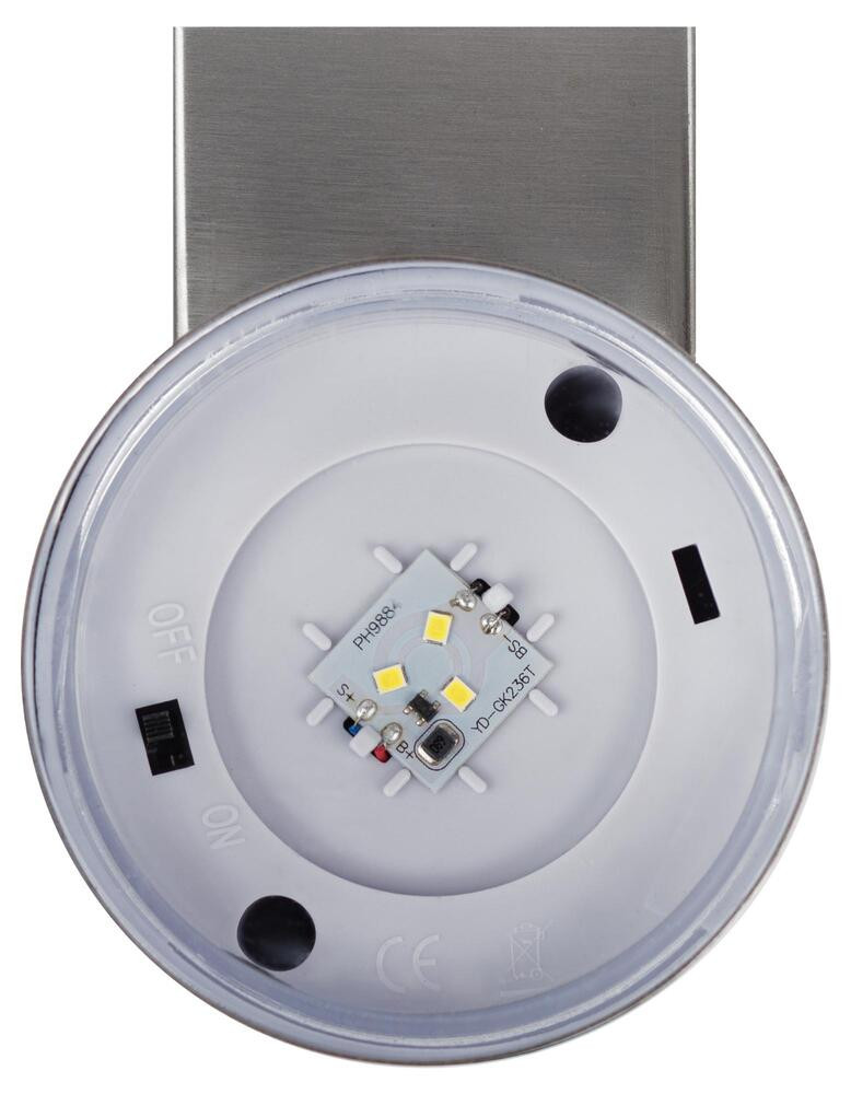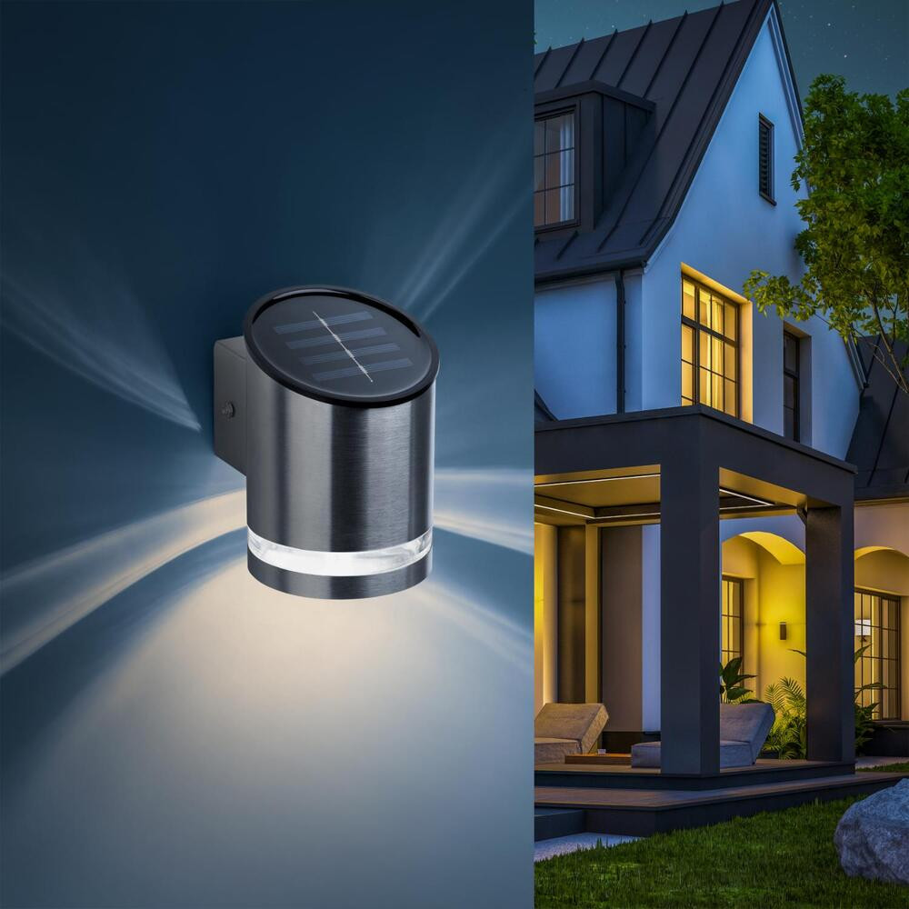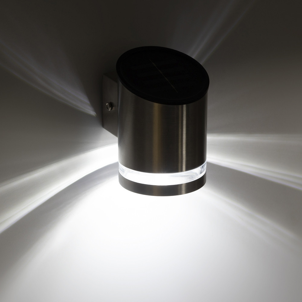 Цилиндрический фасадный светильник ЭРА ERAFS012-03 ''Статус'' (арт. Б0057594) из хромированного металла с прозрачным ободком, эффектно пропускающим свет. Основной световой поток, формируемый 3 современными яркими светодиодами, направлен вниз. Нейтральный белый цвет свечения. Беспроводная фасадная подсветка на солнечной батарее быстро и легко монтируется, крепёж в комплекте. Солнечная панель расположена в верхней части корпуса и накапливает энергию в течение всего светового дня. Дополнительная подсветка вашего фасада автоматически включится с наступлением сумерек и проработает 8 часов до следующей подзарядки. Размеры светильника: 12х9,5х13 см. Отличным решением станет разместить на фасаде здания, на балконе, на гараже сразу несколько таких фасадных светильников.
