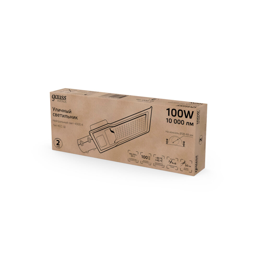 Полное описание товара Светильник уличный консольный ДКУ 100 Вт 10000 лм 4000К AC 220В IP65 420х160х57мм широкая КСС Ш Avenue Gauss (GAUSS) 629534200