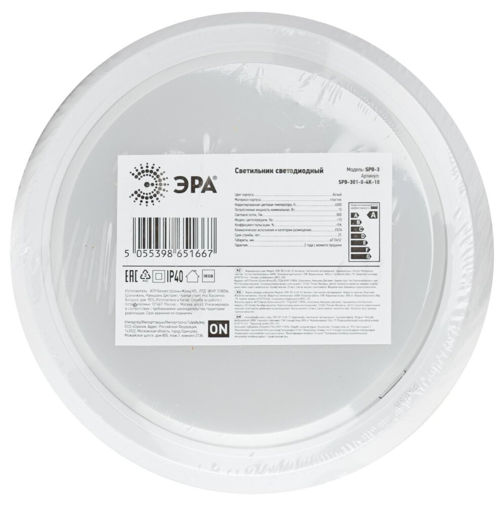 Полное описание товара Светильник ЖКХ светодиодный SPB-301-0-4K-10 IP40 10 Вт 800 Лм 4000К круг накладной (ЭРА) Б0055041