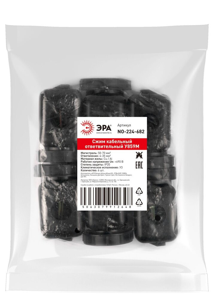 Полное описание товара Сжим ответвительный кабельный У859М (50-70/4-35 мм2) NO-224-682 IP20 (ЭРА) Б0067824