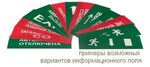 Поставляется в модификациях - основание и рамка — пластмасса, надпись или пиктограмма любая (в пределах информационного поля). Отображенная информация в выключенном состоянии — читаемая или нечитаемая, фон информационного поля — зеленый, красный (подсветка белая), фон информационного поля — белый (подсветка красная).