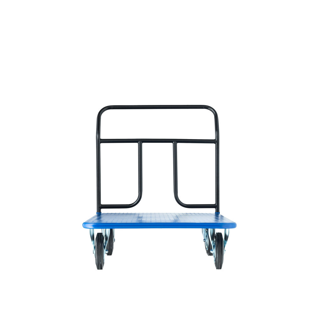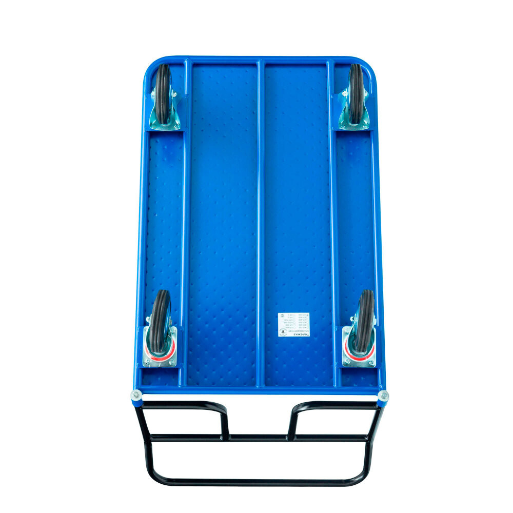 Платформенная 4-х колесная тележка КП-450-200-И используется для перемещения различных грузов в складских помещениях. Ручка крепится к платформе болтами, для компактного хранения можно снять, высота ручки 750мм. Платформа имеет уникальную рельефную, полимерную, противоскользящую поверхность, размером 700х1250мм. Цвет - синий, шагрень. Тележка комплектуется: метизами для крепления, двумя поворотными и двумя неповоротными промышленными колесами, диаметром 200мм., из черной стандартной резины, от всемирно известного, ведущего итальянского производителя Tellure Rota. Грузоподъемность до 690кг.