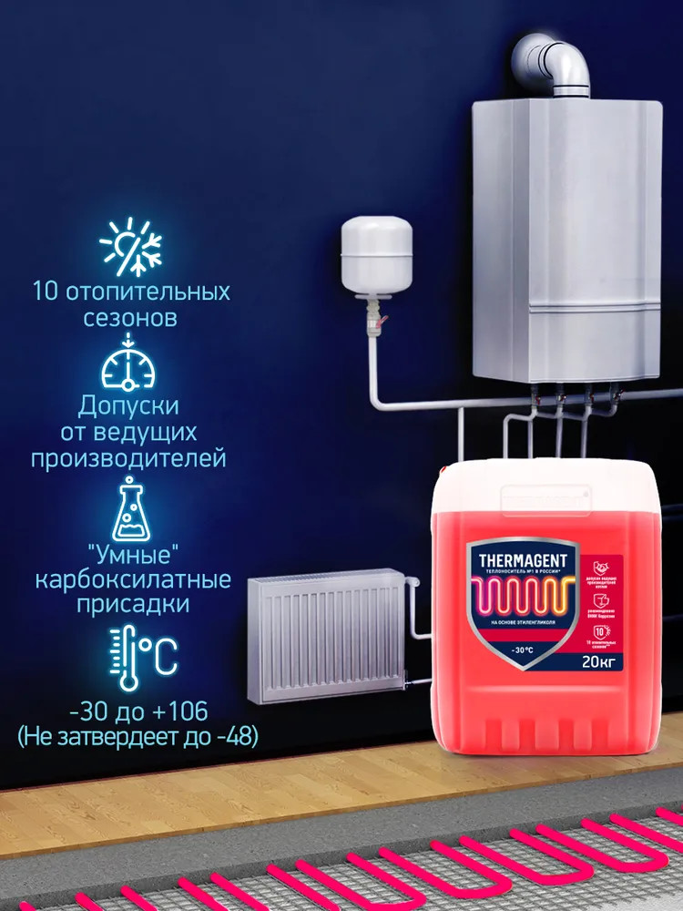 THERMAGENT -30 — теплоноситель на основе высококачественного очищенного этиленгликоля. Предназначен для использования в качестве рабочей жидкости в закрытых системах отопления, вентиляции и кондиционирования для жилых и производственных зданий, систем охлаждения производственного оборудования, чиллеров, холодильных агрегатов и т.д. Подходит для работы в тяжелых климатических условиях. Температура начала кристаллизации составляет -30. В состав добавлены присадки, придающие теплоносителю антикоррозионные, антивспенивающие и антибактериальные свойства. Теплоноситель имеет увеличенный срок службы.