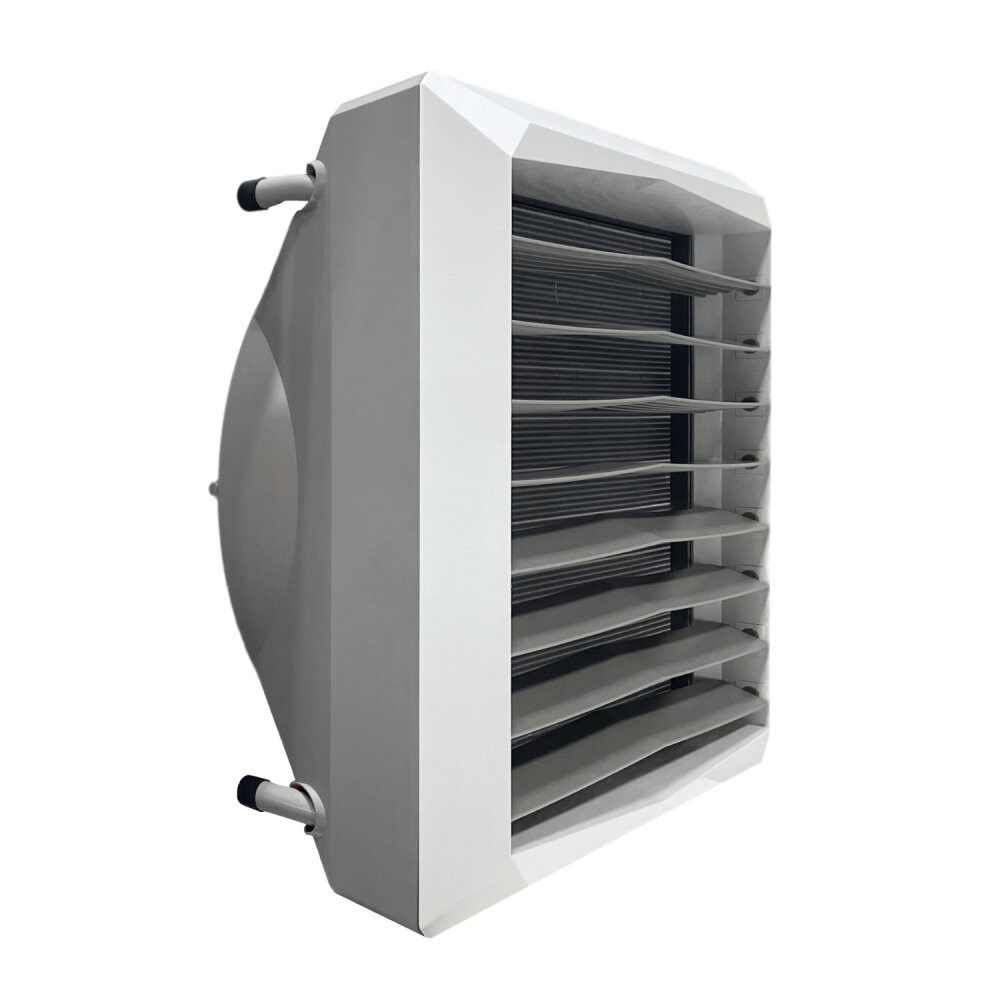 Тепловентилятор с 3-х скоростным АС мотором. Тепловая мощность от 8 до 50 кВт, теплообменник 2-х рядный. Максимальный расход воздуха 4850 м3/час, максимальная длина горизонт потока - 22 м, максимальная длина вертикального потока - 11 м, максимальная температура теплоносителя - 130С, максимальное рабочее давление - 1.6 Мпа. Диаметр присоединительных патрубков 3/4''. Масса агрегата - 21.5 кг. Мощность электродвигателя 0.28 Вт, степень защиты IP двигателя 54.