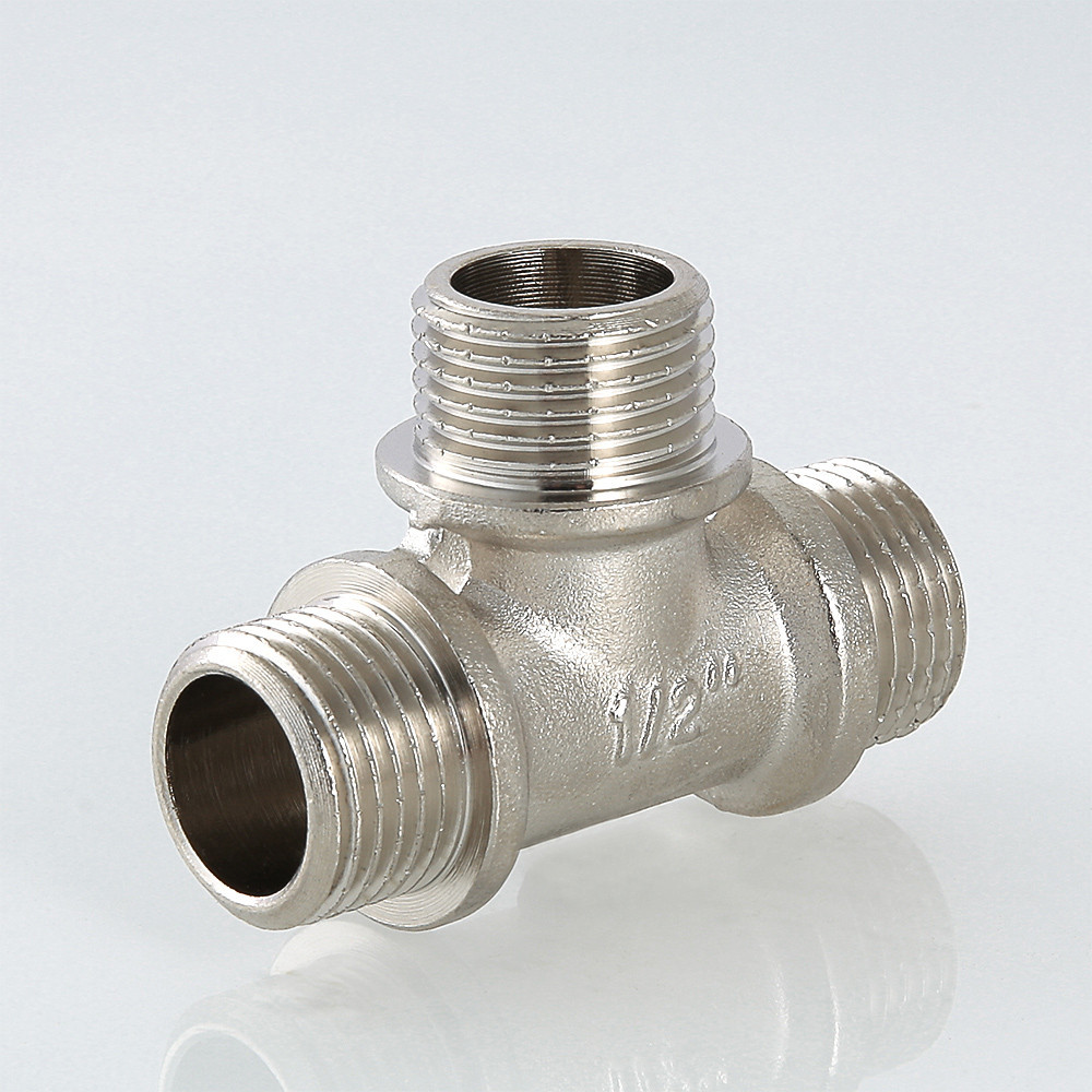 Латунный никелированный трехсторонний фитинг (тройник), равнопроходной. Резьба - наружная, цилиндрическая трубная по ГОСТу 6357 (ISO 228, EN 10226).