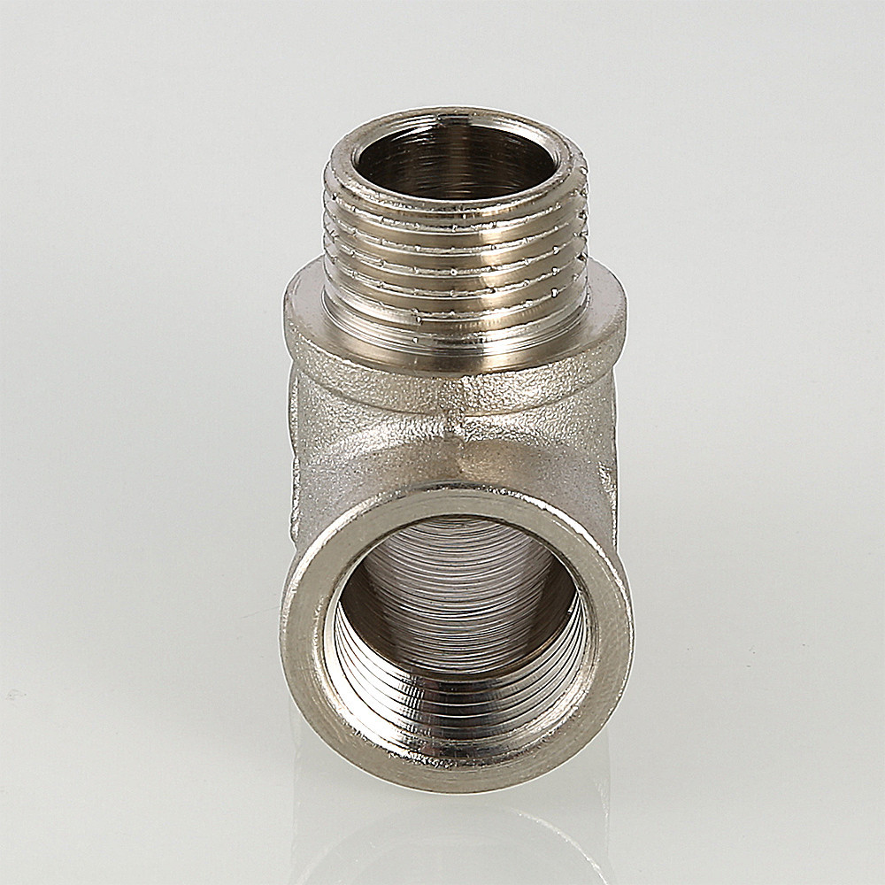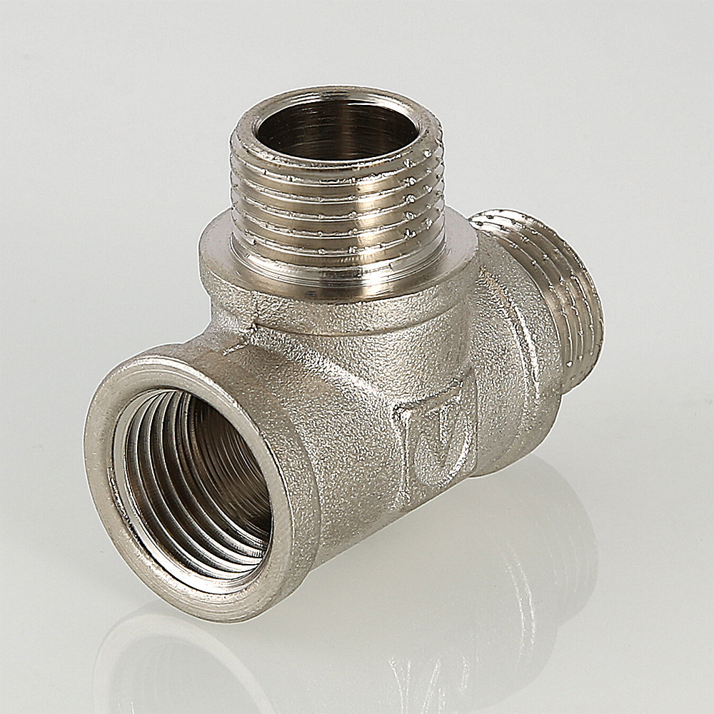 Латунный никелированный трехсторонний фитинг, равнопроходной. Резьба - внутренняя/наружная/наружная, цилиндрическая трубная по ГОСТу 6357 (ISO 228, EN 10226). Внутренняя резьба совместима также с наружной конической трубной резьбой по ГОСТу 6211 (ISO R7).