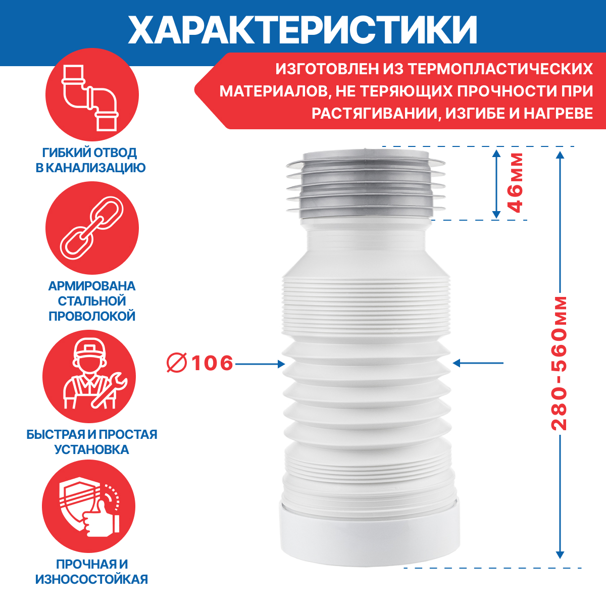 Армированный удлинитель для унитаза 560 мм ИС.110716 выполняет функцию фановых труб для соединения унитаза с канализационной системой. Удлинитель отличается удобством при монтаже - при соединении унитаза с канализацией нет необходимости заранее замерять угол установки, как в случае с фановыми трубами. Выход в канализацию оформлен в виде эластичной гребенки, которая идеально подходит для соединения с пластиковыми или чугунными трубами. Гофрированная часть трубы армирована стальной проволокой, что существенно повышает прочность и износостойкость изделия. Длина гофры с сжатом состоянии 280 мм, в раскрытом 560 мм.