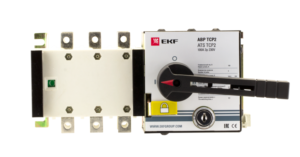 Устройство АВР ТСP1 EKF PRPxima предназначено для обеспечения резервным электроснабжением нагрузки, подключенной к системе электроснабжения, имеющей основной и резервный вводы. Устройство АВР автоматически подключает резервную линию питания в случае пропадания напряжения на основной линии. Выполнено в виде моноблока и состоит из контактного блока и блока управления. На блоке управления имеется рычаг ручного переключения, замковый механизм перевода в ручной или автоматический режимы управления и запорный механизм, обеспечивающий блокировку переключения устройства АВР. Корпус контактного блока выполнен из термостойкой АВС пластмассы. Механизм переключения обеспечивает перемещение контактных групп мостикового типа, которые замыкают цепи или основной линии, или резервной линии, также предусмотрено положение, когда обе линии отключены.