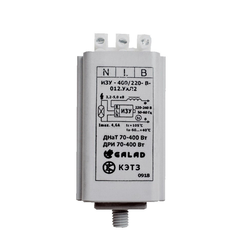 Это импульсное зажигающее устройство предназначено для зажигания газоразрядных ламп - натриевых (ДНаТ70-400) и ртутных (ДРИ70-400). ИЗУ выдает импульсы высокого напряжения (3,2 - 5,0 кВ), которые зажигают электрическую дугу в лампе. Устройство функционирует нормально при температуре от -60 до +40 С (климатическое исполненик - УХЛ2).