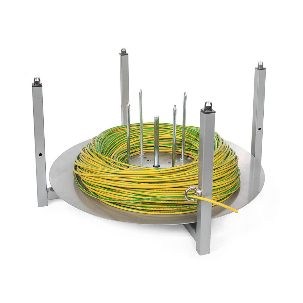 - Краткая характеристика: - Максимальный диаметр бухты: 480 мм; - Максимальная высота бухты: 150 мм; - Внутренний диаметр бухты: 80-230 мм; - Регулировочные стержни для фиксации бухты на диске в зависимости от внутреннего диаметра; - Опорные профили с роликами для наиболее легкого вращения дисков; - Рым-болт с кольцом для подачи провода при размотке; - Два варианта сборки устройства: стойками вверх, стойками вниз
