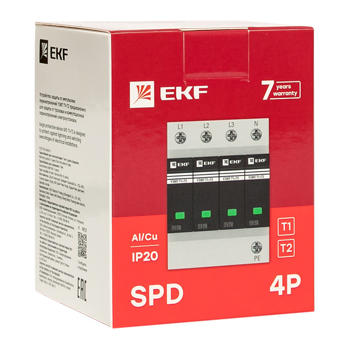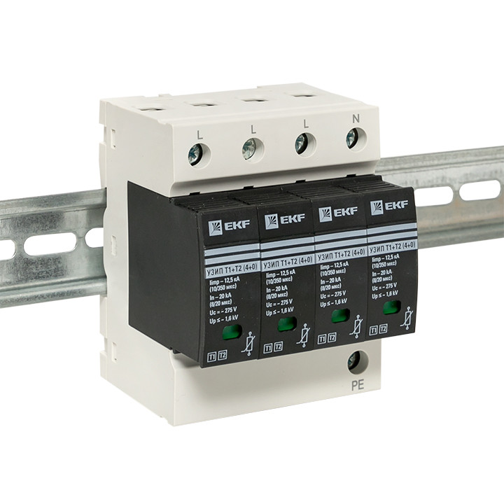 Полное описание товара Устройство защиты от импульсных перенапряжений Т1+Т2, Iimp-12,5kA, In-20kA, Uc-275В, 4+0 (EKF) OV12-4-504