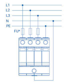 Четырехполюсное УЗИП класса I+II комбинированного типа. УЗИП выполнено из трех варисторных модулеи, и одного модуля с разрядником и базы для подключения к сети и креплению на DIN-рейку 35 мм. УЗИП выдерживает токовые нагрузки, соответствующие УЗИП класса I, а по способности ограничения импульсных напряжении, допустимых для изоляции оборудования, соответствует УЗИП класса II. Устанавливается в пределах 0А(В) – 1 зон молниезащиты (в соответствии с ГОСТ Р МЭК 62305-1 и СО-153-34.21.122). Применяется для сетеи с системами заземления - TN-S, TT. Рекомендуемый номинал предохранителя не менее 125 А gL/gG.