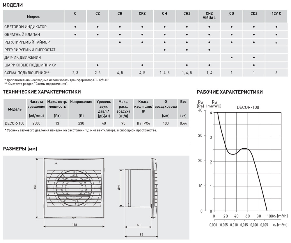 Осевой вентилятор серии Decor с компактным тонким корпусом Slimline, изготавливается из высококачественного ABS пластика, имеет световой индикатор работы и обратный клапан. Однофазный электродвигатель (230В-50Гц), класс изоляции B, со встроенной термозащитой. Вентилятор с низким уровнем шума.