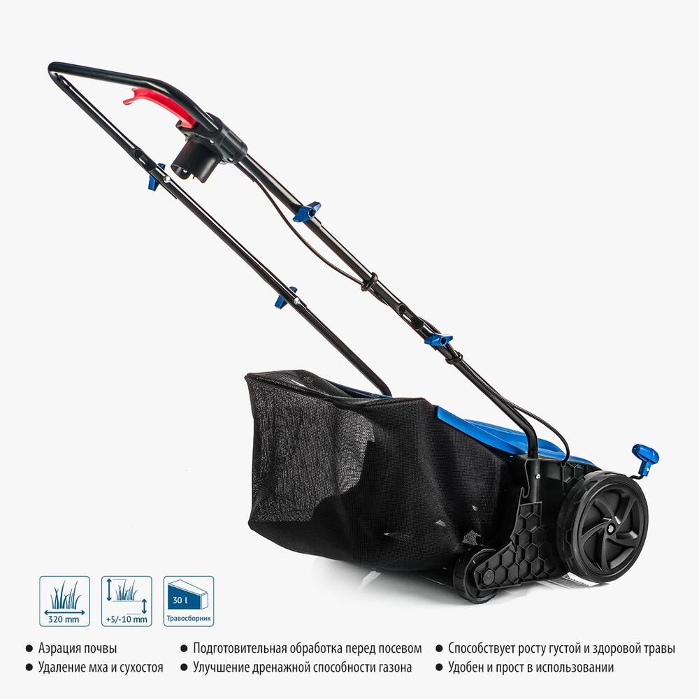 - Комплектация: скарификатор|барашковые гайки и винты для ручки - 4 шт|винты скрестообразным шлицем - 2 шт|верхняя ручка|средняя ручка - 2 части|нижняя ручка - 2 части|травосборник|корпус выключателя|зажимы для шнура - 2 шт|шестигранный ключ|рабочая ось скарификатора(предварительно установленная)|рабочая ось граблей