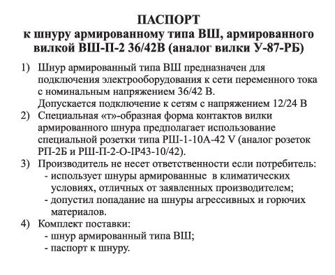 Шнур армированный типа ВШ предназначен для подключения электрооборудования к сети переменного тока с номинальным напряжением 36/42 В. Допускается подключение к сетям с напряением 12/24 В. Специальная ''т''-образная форма контактов вилки армированного шнура предполагает использование специальной розетки типа РШ-1-10А-42 (аналог розеток РП-2Б и РШ-П-2-О-IP43-10/42).