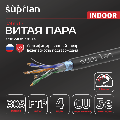Полное описание товара Витая пара F/UTP кат 5e 4x2x0.51 Premium Cu PE OUT 305м (SUPRLAN) 01-1010-4