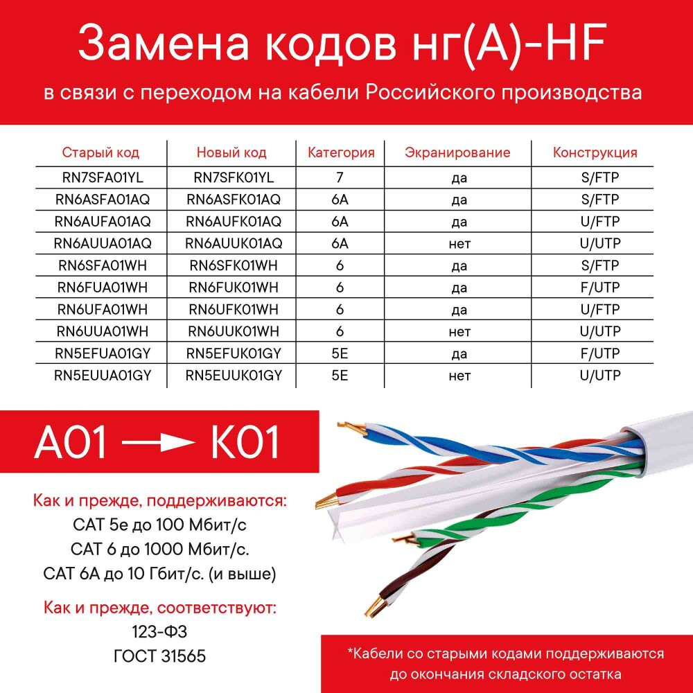 Экранированные кабели c конструкцией S/FTP категории 6 в исполнении нг(А)-HF не распространяют горение при групповой прокладке при испытании по ГОСТ IEC 60331-23 с объемом горючей массы неметаллических элементов конструкции 7,0 л/м (класс А). Безгалогенные кабели обладают низкой дымообразующей способностью и не имеют в продуктах горения корозионноактивных газов. Снижение светопропускания в режиме горения и тления не превышает 40% при испытании по ГОСТ IEC 61034-2. Коррозионная активность газов, которые выделяются при активном горении материалов, соответствует показателю ПКА 1 при испытаниях по ГОСТ IEC 60754-1, ГОСТ IEC 60754-2. Класс пожарной опасности П1б.8.1.2.1.