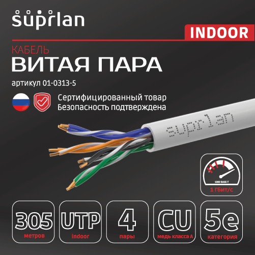 Полное описание товара Витая пара U/UTP кат 5e 4x2x0.51 Premium Cu PVC IN 305м (SUPRLAN) 01-0313-5