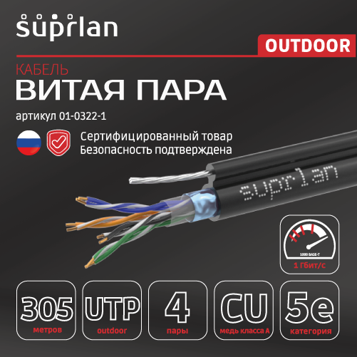 Полное описание товара Витая пара U/UTP кат 5e 4x2xAWG24 Standart Cu PE OUT T-FG8 трос 305м (SUPRLAN) 01-0322-1