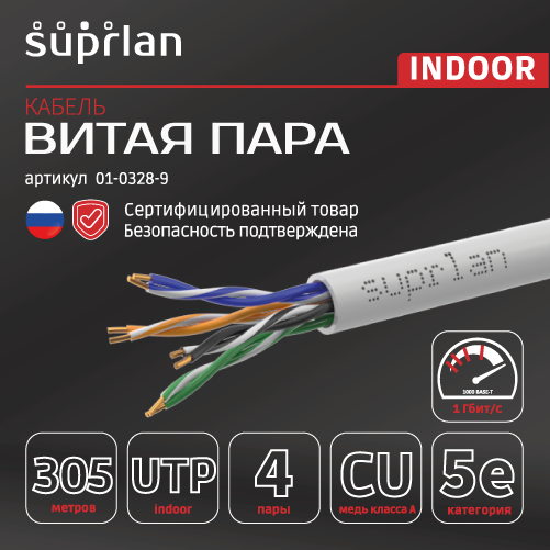 Витая пара U/UTP кат 5e 4x2xAWG24 Standart Cu PVC IN 305м (SUPRLAN) 01-0328-9