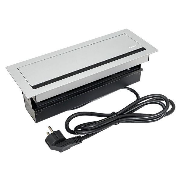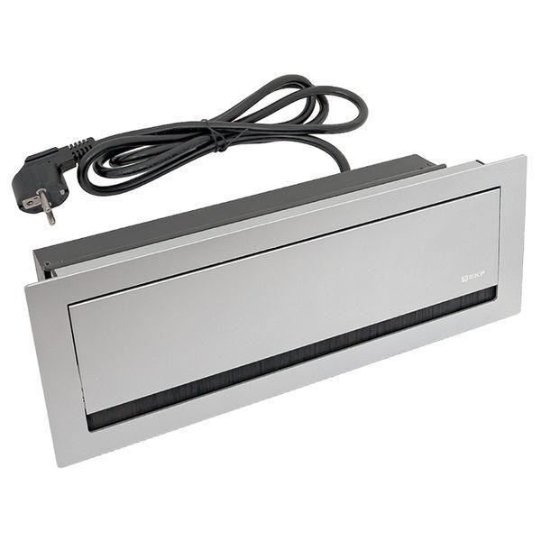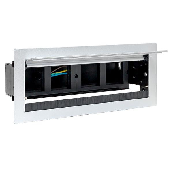 Встраиваемый настольный лючок, 8 модей, C-Line. Настольный лючок – изделие, включающее в себя верхнюю открывающуюся крышку и кронштейны для крепления приборных рамок и приборной коробки. Настольный лючок предназначен для размещения ЭУИ в столе. Монтаж производится в предварительно подготовленное отверстие 284х104 мм для 8 модулей. Сетевой кабель питания (2 метра), приборная коробка, приборные рамки и крепеж в комплекте.