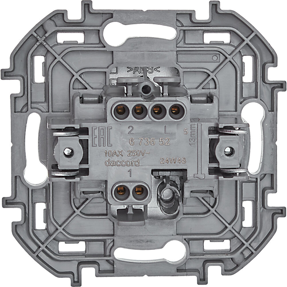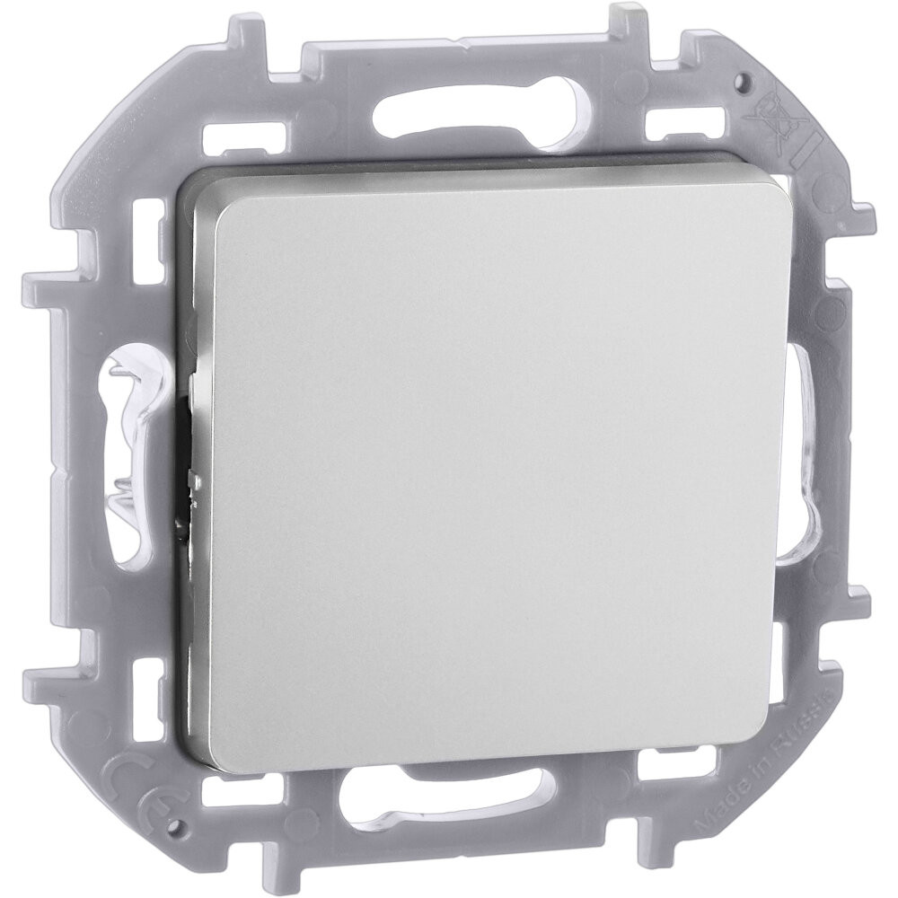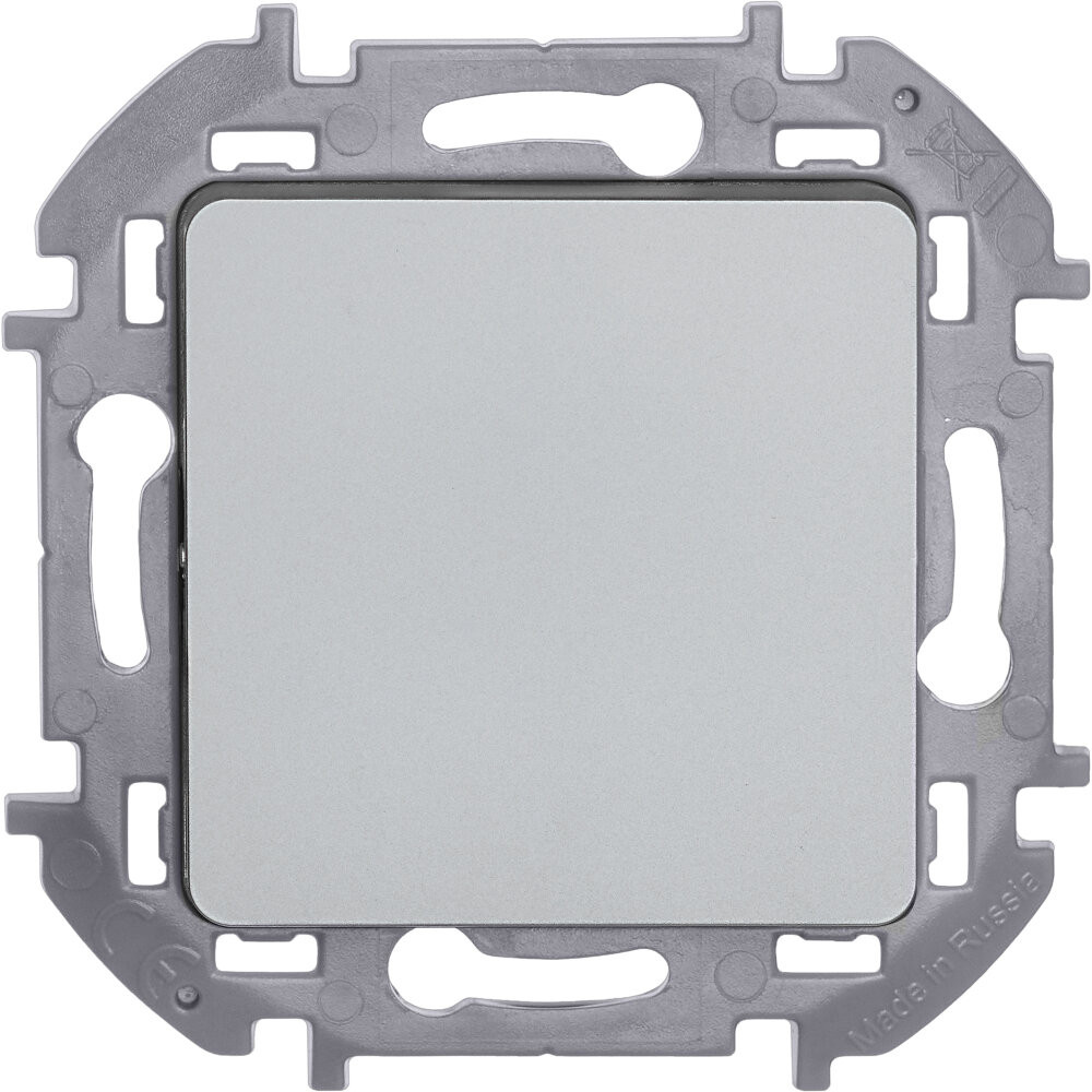Переключатель одноклавишный скрытого монтажа Inspiria, цвет ''Алюминий'', номинальный ток 10АХ, напряжение ~250В, безвинтовые зажимы. Устанавливается в жилых и общественных помещениях для управления приборами освещения, вентиляции и т.д. Предназначен для управления одной нагрузкой с одного, двух или более мест (совместно с перекрёстными переключателями).