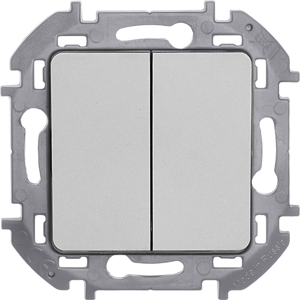 Выключатель двухклавишный скрытого монтажа Inspiria, цвет ''Алюминий'', номинальный ток 10АХ, напряжение ~250В, безвинтовые зажимы. Устанавливается в жилых и общественных помещениях для управления приборами освещения, вентиляции и т.д. Предназначен для управления двумя электрическими цепями.