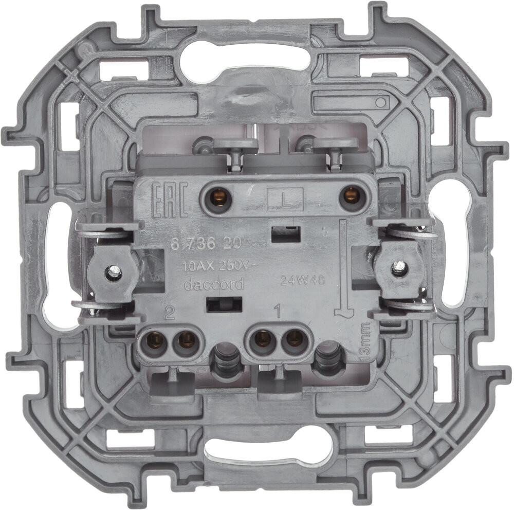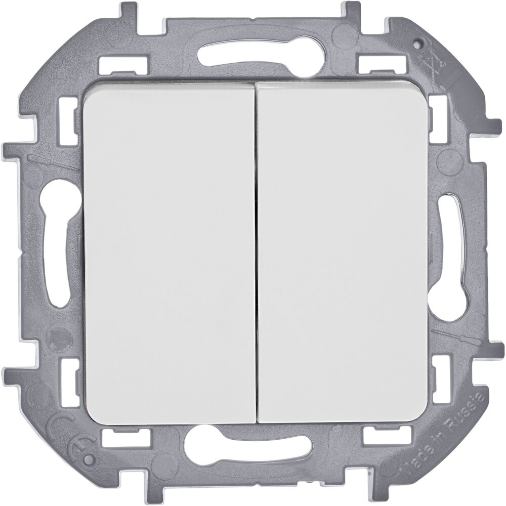 Выключатель двухклавишный скрытого монтажа Inspiria, цвет ''Белый'', номинальный ток 10АХ, напряжение ~250В, безвинтовые зажимы. Устанавливается в жилых и общественных помещениях для управления приборами освещения, вентиляции и т.д. Предназначен для управления двумя электрическими цепями.