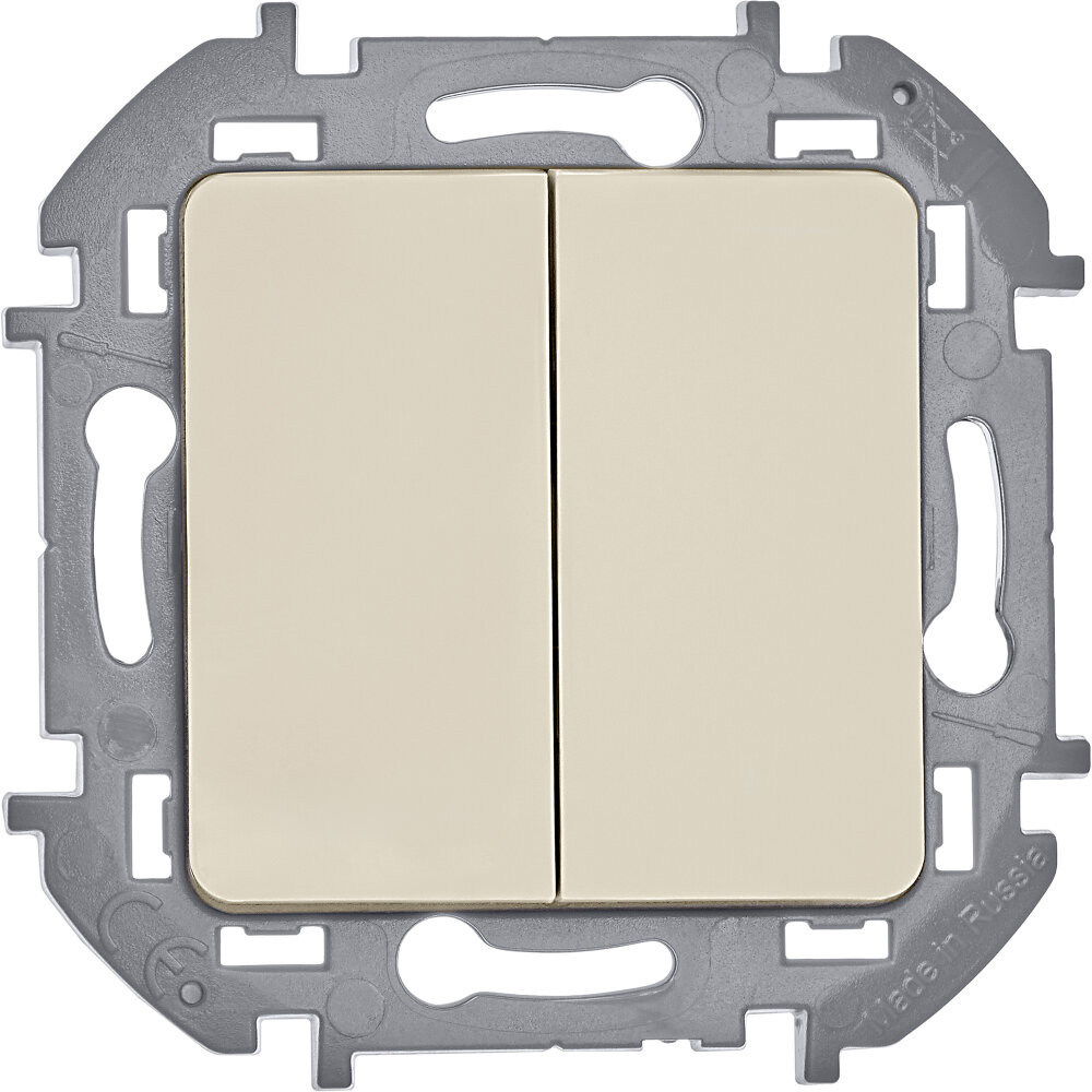 Выключатель двухклавишный скрытого монтажа Inspiria, цвет ''Слоновая кость'', номинальный ток 10АХ, напряжение ~250В, безвинтовые зажимы. Устанавливается в жилых и общественных помещениях для управления приборами освещения, вентиляции и т.д. Предназначен для управления двумя электрическими цепями.