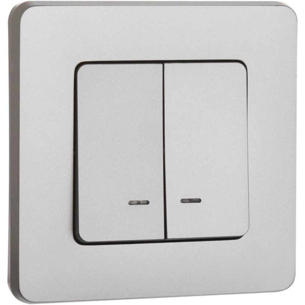 Выключатель двухклавишный с подсветкой/индикацией скрытого монтажа Inspiria, цвет ''Алюминий'', номинальный ток 10АХ, напряжение ~250В, безвинтовые зажимы. Устанавливается в жилых и общественных помещениях для управления приборами освещения, вентиляции и т.д. Предназначен для управления двумя электрическими цепями.