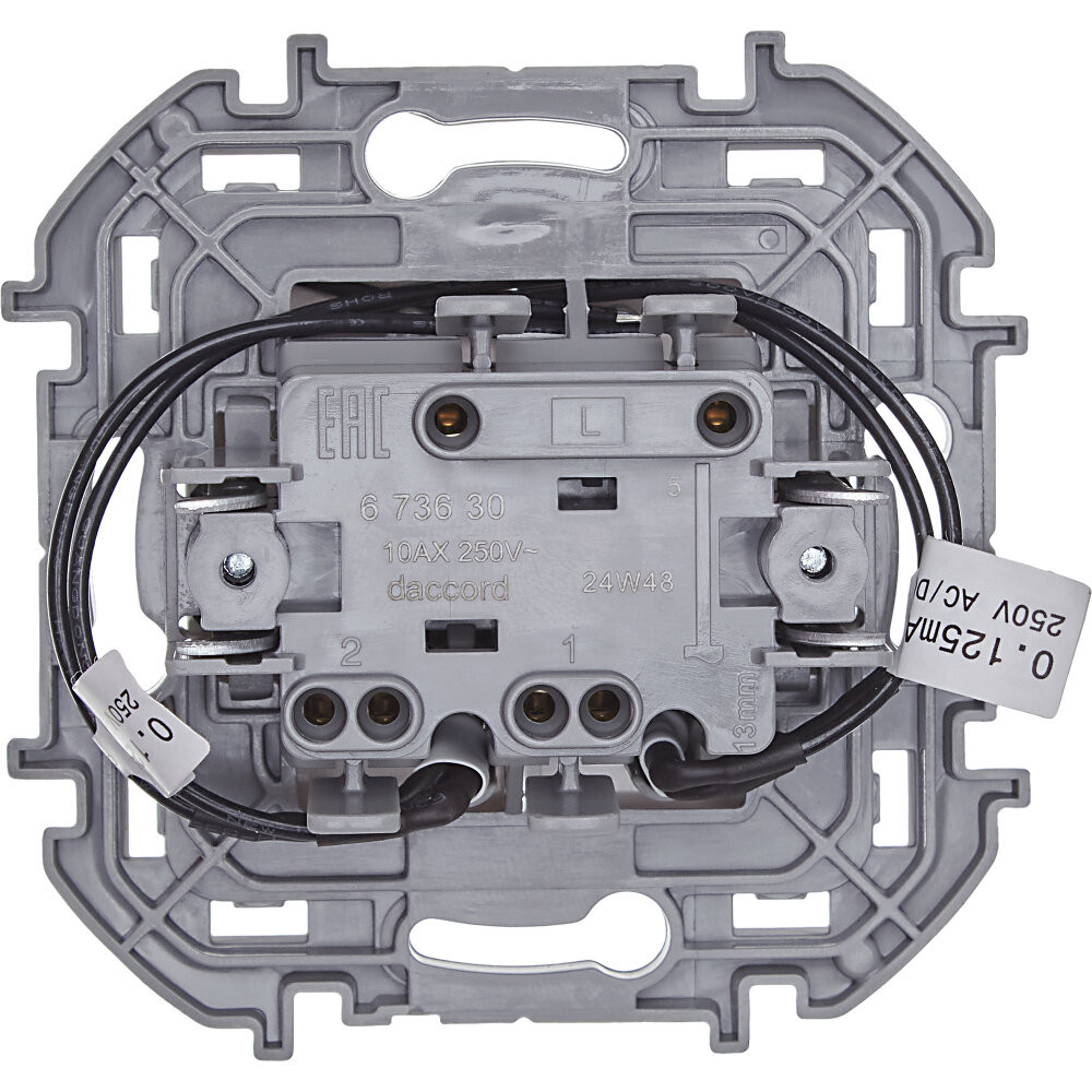 Выключатель двухклавишный с подсветкой/индикацией скрытого монтажа Inspiria, цвет ''Белый'', номинальный ток 10АХ, напряжение ~250В, безвинтовые зажимы. Устанавливается в жилых и общественных помещениях для управления приборами освещения, вентиляции и т.д. Предназначен для управления двумя электрическими цепями.