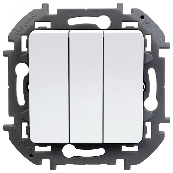 Выключатель трёхклавишный скрытого монтажа Inspiria, цвет ''Белый'', номинальный ток 10АХ, напряжение ~250В, винтовые зажимы. Устанавливается в жилых и общественных помещениях для управления приборами освещения, вентиляции и т.д. Предназначен для независимой коммутации трёх нагрузок с одного места. Подходит для управления многорожковыми люстрами и осветительными приборами с большим количеством ламп.