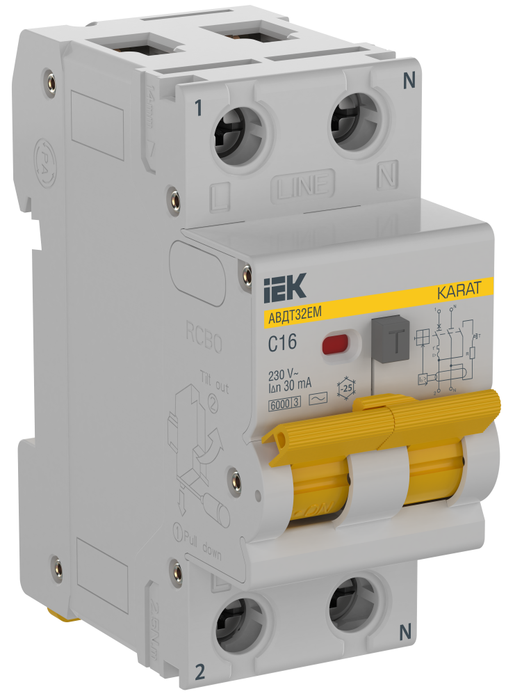 Полное описание товара Выключатель автоматический дифференциального тока АВДТ 32EM 1P C16 30мА тип A KARAT электромеханический (IEK) KA-VD14-1-016-C-030-AC