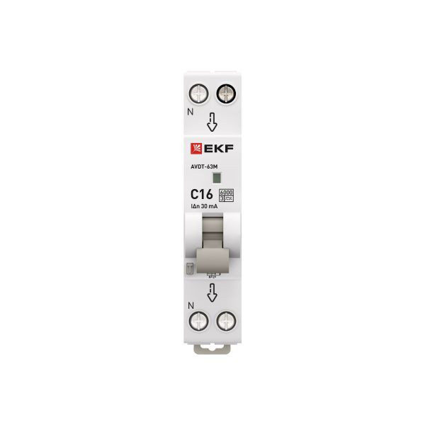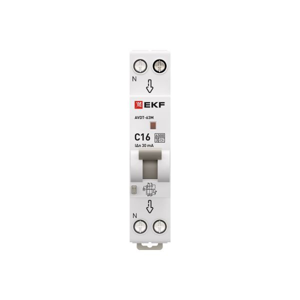 Автоматический выключатель дифференциального тока малогабаритный АВДТ-63М PROXIMA EKF представляет аппарат, сочетающий функции автоматического выключателя с электронным УЗО типа АС в компактном корпусе шириной один модуль. При обнаружении автоматическим выключателем на защищаемом участке сети тока утечки (повреждения) на землю или сверхтока (тока перегрузки или короткого замыкания) происходит срабатывание устройства, приводящее к отключению защищаемой сети. Особое отличие дифференциальных автоматических выключателей EKF с электронным УЗО – в наличии блока защиты от перенапряжения. Соответствует ГОСТ IEC 61009-1.