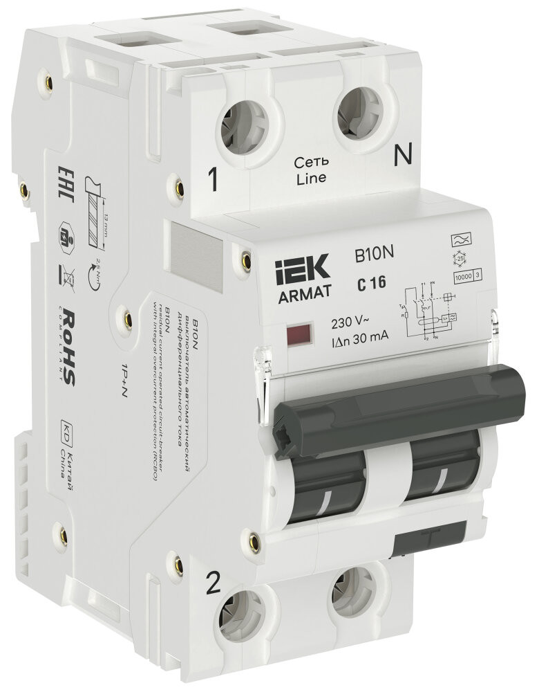 Полное описание товара Выключатель автоматический дифференциального тока B10N 1P+NP C16 30мА тип A (36мм) (IEK) AR-B10N-1N-C016A030